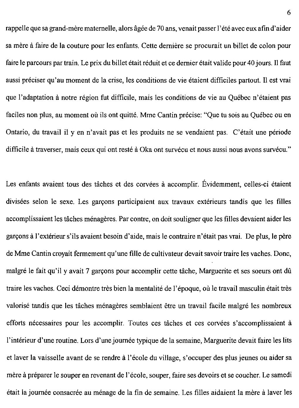Travail de recherche sur le vécu de Mme Marguerite Cantin, par Josée Thibodeau.