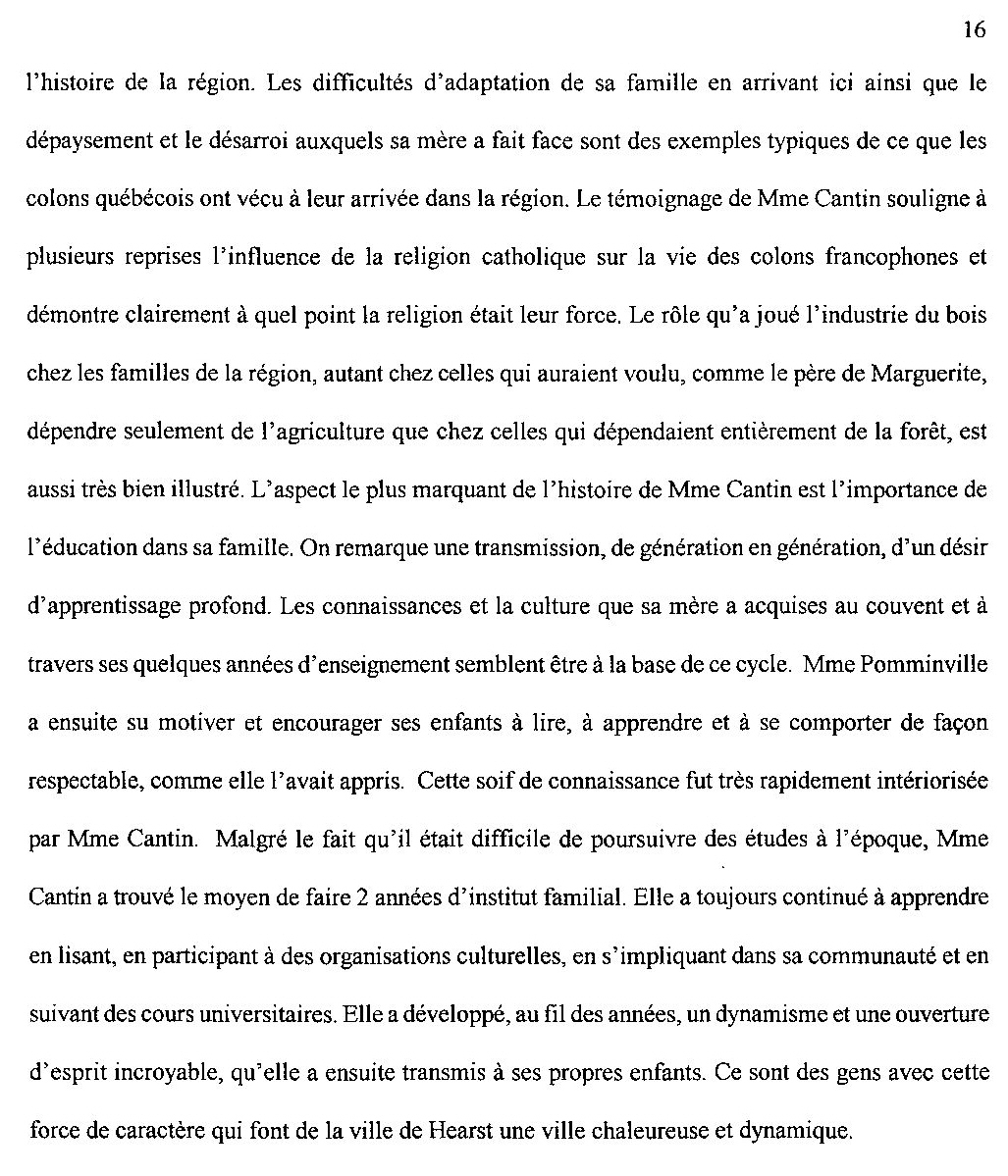 Travail de recherche sur le vécu de Mme Marguerite Cantin, par Josée Thibodeau.