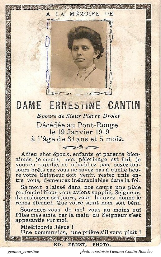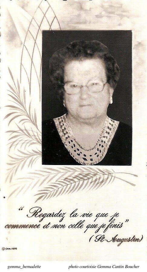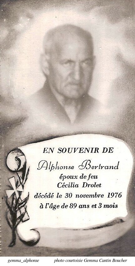 Alphonsine: née le 29 octobre, 1882. Mariée avec Ernest Cantin le 2 mai, 1905. Décédée le 12 juillet, 1974. Mariage double avec Joseph Pierre (son frère, né en 1875) et Célerine Cantin (soeur d'Ernest). Elle est la matriache de la famille Cantin, établie au nord de l'Ontario en 1934 . C'est aussi ma grand-mère :-)