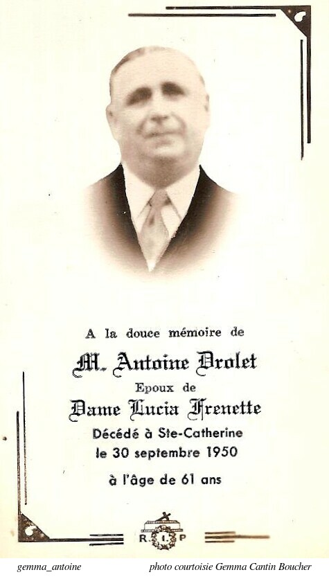 Antoine: né en 1889. Marié avec Lucia Frenette. Décédé le 30 septembre, 1950.