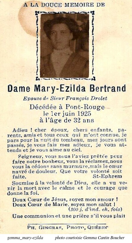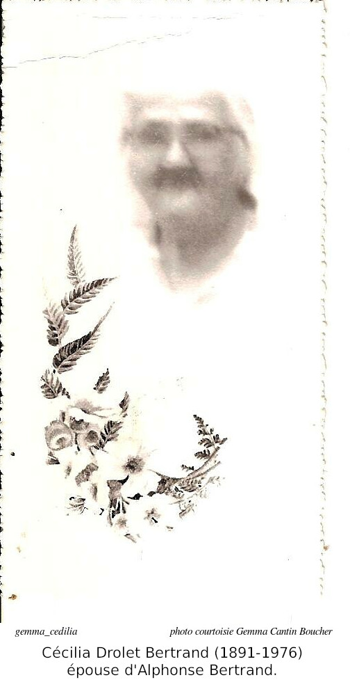 Cécilia: née en décembre 1891. Mariée Alphonse Bertrand. Décédée le 15 janvier, 1976.