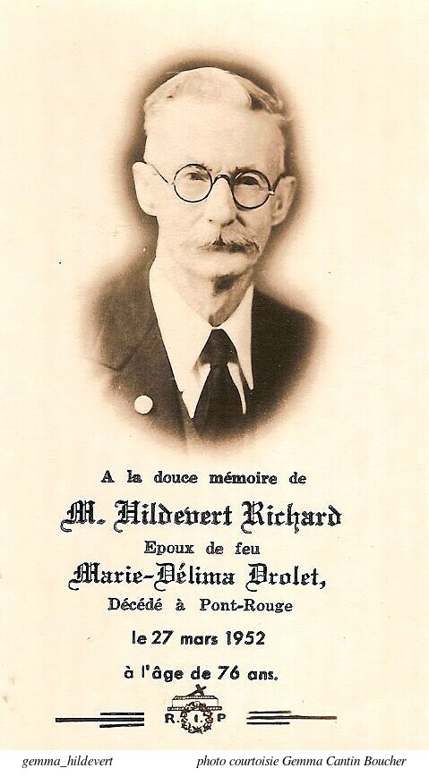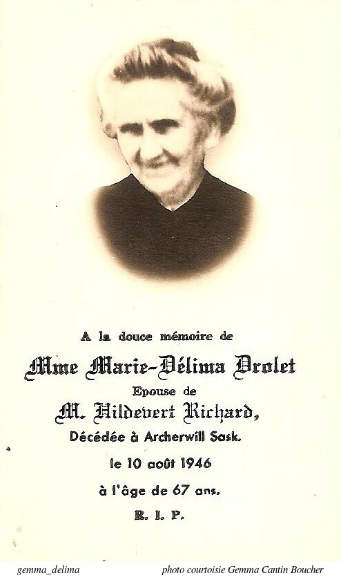 Délima: née en 1879. Mariée avec Hildevert Richard. Décédée le 10 août, 1946. Une des deux soeurs, l'autre étant Philomène, à avoir demeurée en Saskatchewan.