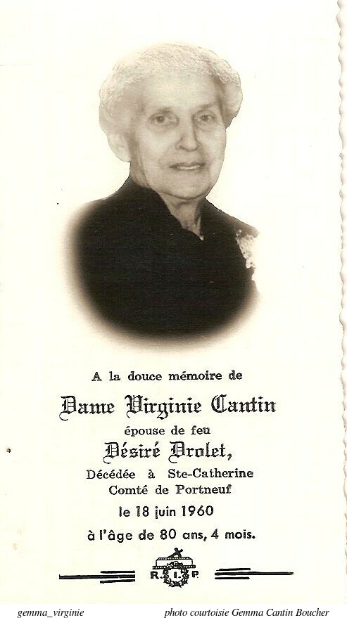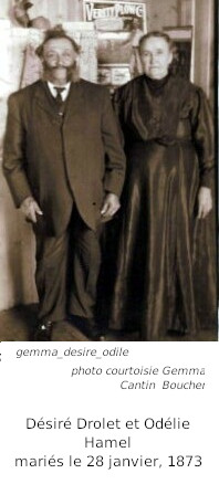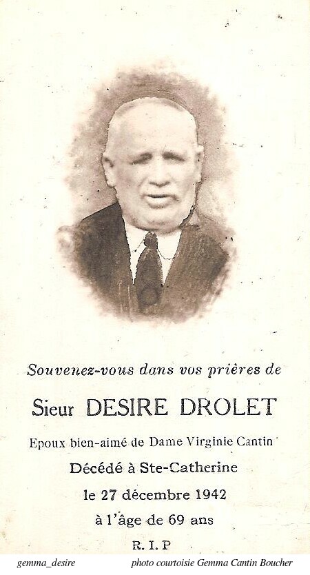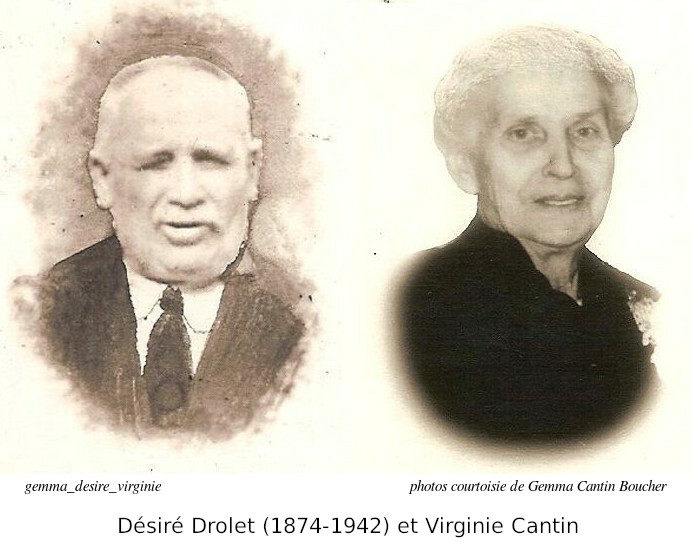 Désiré: né en 1874. Marié avec Virginie Cantin le 9 juillet, 1901. Décédé le 27 décembre, 1942. Virginie est la soeur d'Ernest Cantin, mari d'Alphonsine Drolet. C'est le premier mariage entre la famille de Désiré Drolet et de Joseph Cantin; il y en aura trois autres. |