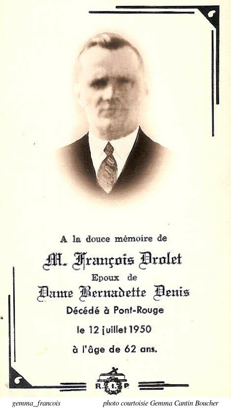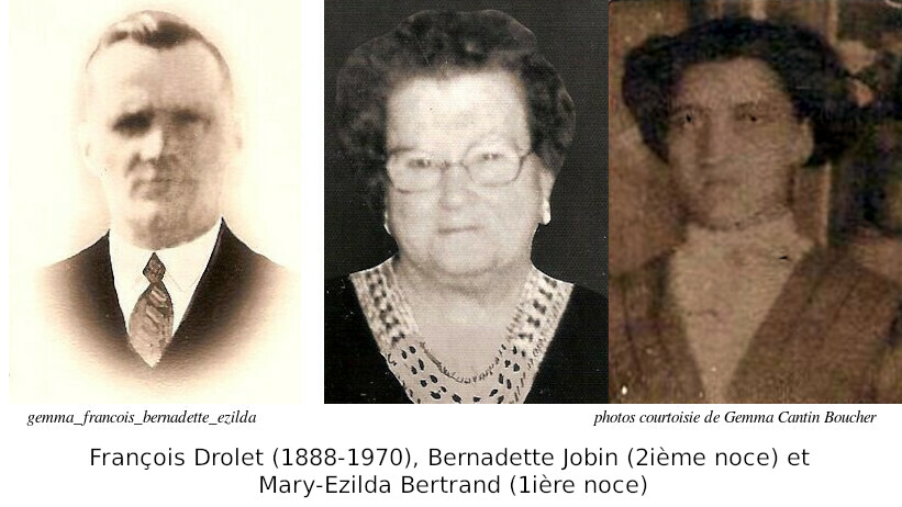 François: né en octobre 1888. A épousé en premières noces Marie-Ézilda Bertrand et en deuxièmes noces Bernadette Jobin. Il est décédé le 12 juillet, 1950.