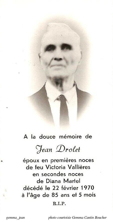 Jean: né en octobre, 1884. A épousé en premières noces Victoria Vallières et en deuxièmes noces Diane Martel. Il est décédé le 22 février, 1970.