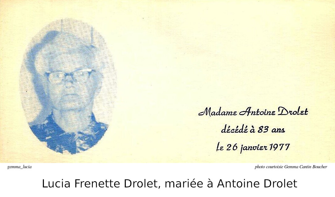 Léa: née en 1900 ("Marie Lea Lucia Drolet", selon https://www.familysearch.org). Date de décès inconnue. Aucune photo; aucune information dans le document contenant les ancêtres Drolet reçu de Gemma concernant Léa; information receuilli des site généalogiques https://www.familysearch.org et https://www.myheritage.com.