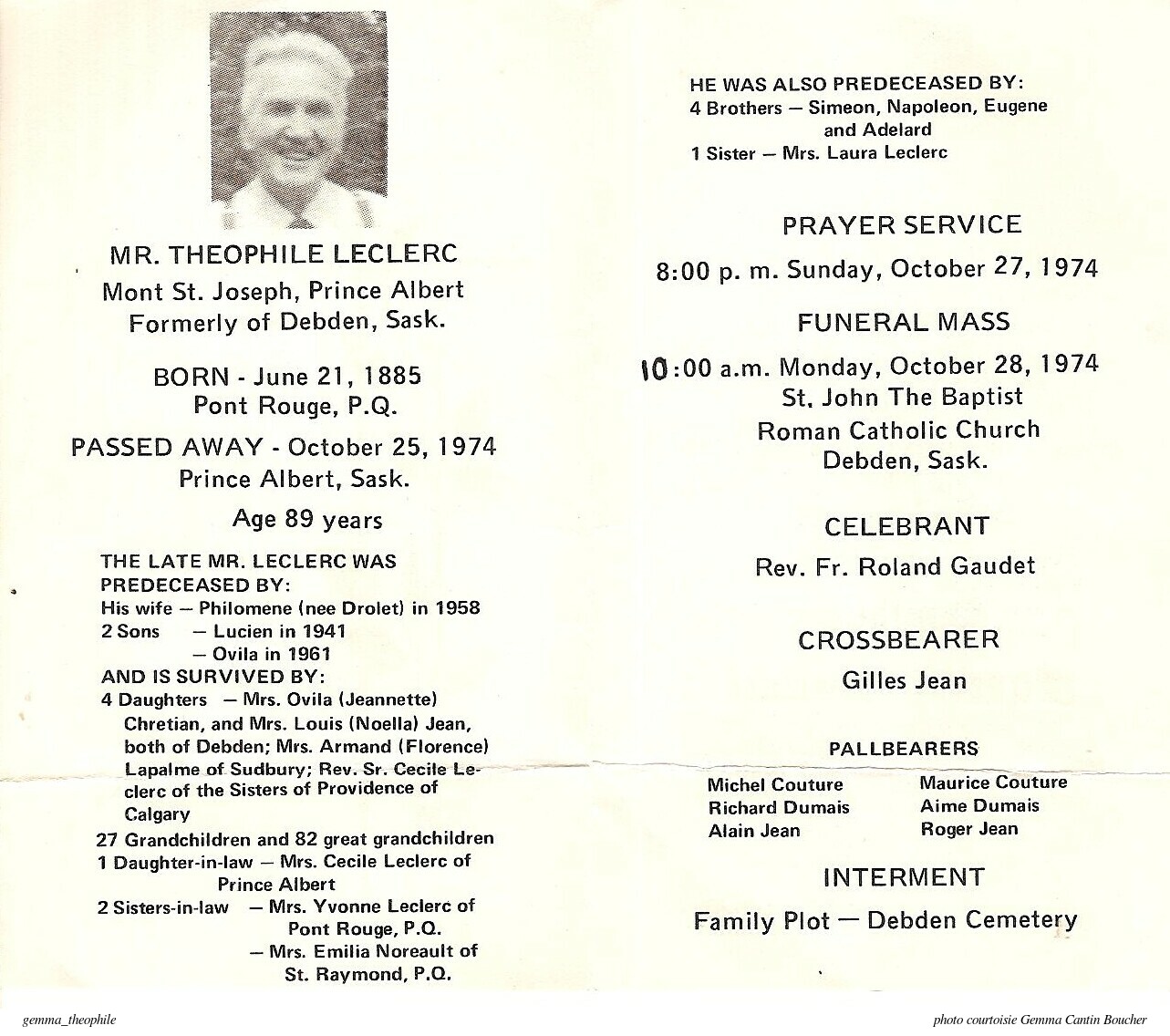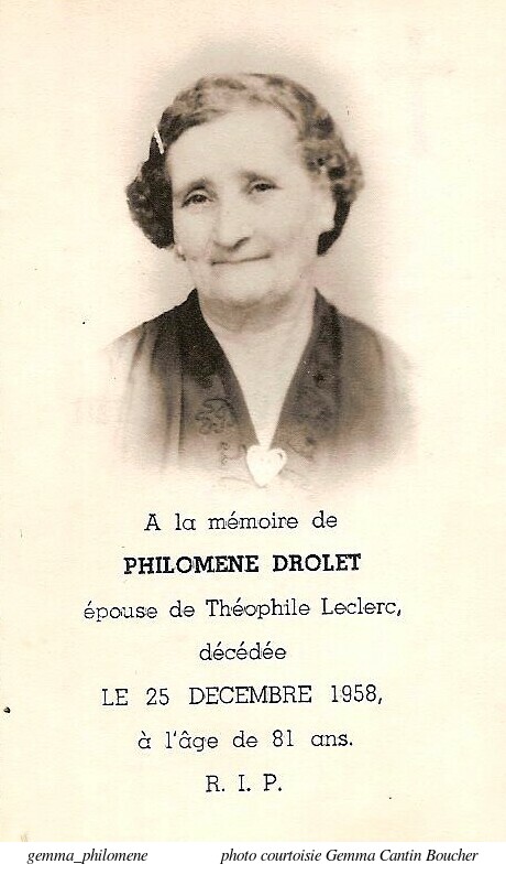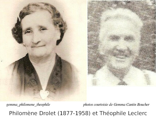 Philomène: née en 1877. Mariée à Théophile Leclerc. Décédée le 25 décembre, 1958. Une des deux soeurs, l'autre étant Délima, à avoir demeurée en Saskatchewan.