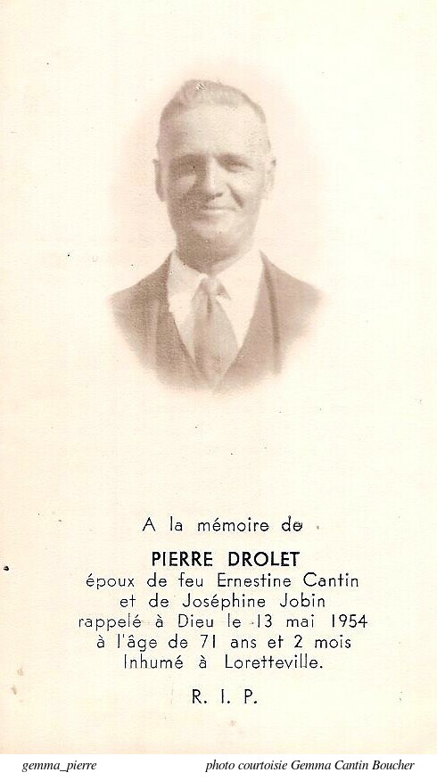 Pierre: né en mars, 1883. A épousé en premières noces Ernestine Cantin et en deuxièmes noces Joséphine Jobin. Il est décédé le 13 mai, 1954. A ne pas confondre avec Joseph Pierre!
