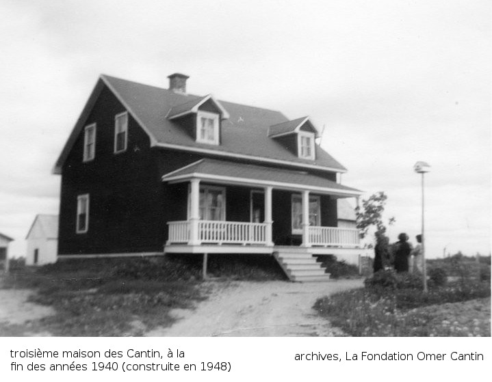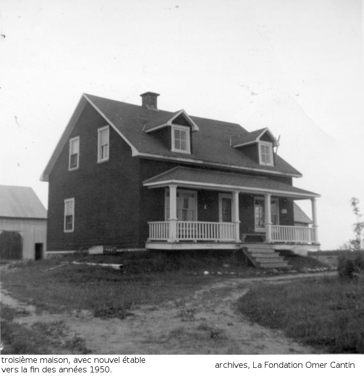 La troisième maison maternelle est construite alors que seulement Pierre et Ernest n'étaient pas mariés. Elle deviendra celle de Pierre, et où Alphonsine y demeurera jusqu'en 1962. Alphonsine déménagera alors avec Marie et Ubald, qui finisaient d'élever leur famille, alors que Pierre et Irène n'avaient pas encore fini leur famille. Nous avons quelques photos de cette troisième maison: la première photo alors qu'elle venait d'être construite, et la deuxième, 10 ans plus tard. Sur la première, nous y voyons le coin de l'étable originale, alors que la deuxième nous montre la grange agrandie (i.e. étable originale démolie). Cette maison est encore sur la terre, en bon état. La Fondation Omer Cantin a entreprit de la rénover, tel quelle était au début des années 1950. Nous vous invitons à visiter la page Facebook de "La Fondation Omer Cantin" (https://www.facebook.com/La-Fondation-Omer-Cantin-185914908100294) pour des détails.