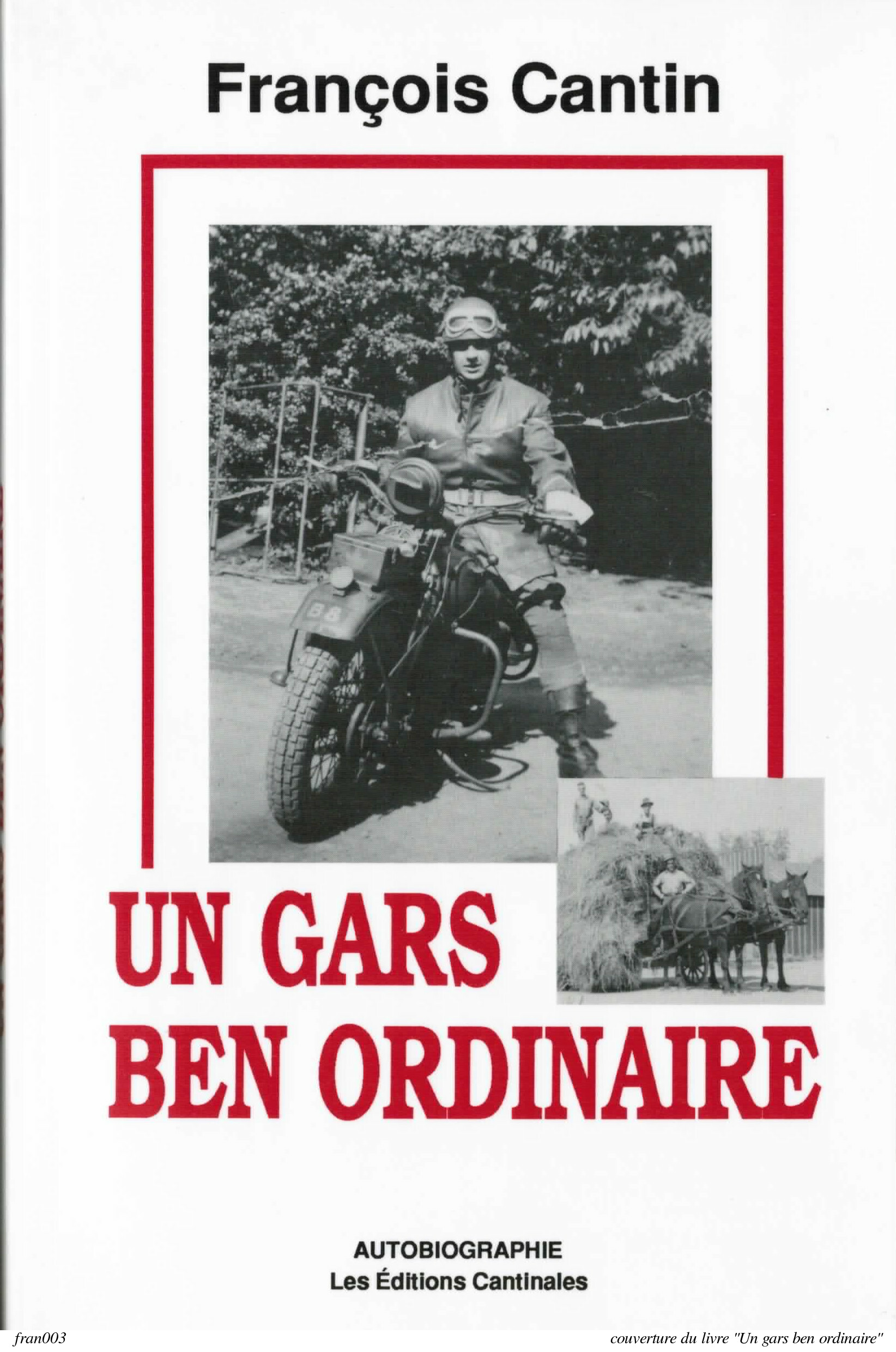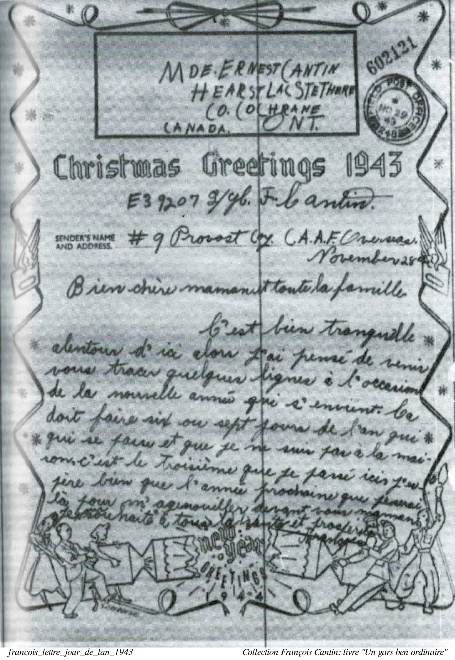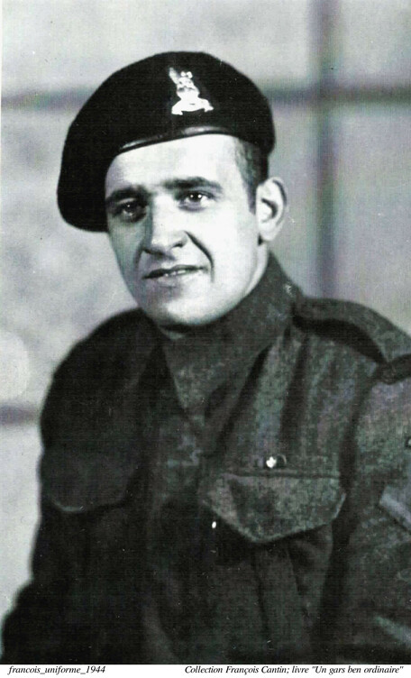Il passe un an d'entrainement en Angleterre, faisant partie d'une section de 25 soldats (une compagnie a 6 sections), chacun avec sa motocyclette. Il a l'expérience personelle du "blitz" de la deuxième guerre à Londres. Sa section débarquera près de deux ans plus tard, au printemps 1944, en Normandie, 14 jour après le premier débarquement. Il est affecté à un groupe de chars blindés. Il passera le restant de la guerre près du front... Dans son livre, "Un gars ben ordinaire" (Les Editions Cantinales), François a dédié 60 pages sur son expérience de la guerre. C'est fascinant à lire. En plus de la photo de François avec sa motocyclette (page courverture du livre), nous avons une photo de François en uniforme (1944), et une copie d'une carte de Noël qu'il a envoyé à sa famille en 1943.
