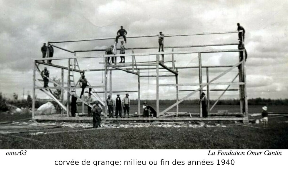 Nous avons aussi trois photos, représentant les trois granges qui furent construites dans les années 1940. Comme mentionné ci-haut, vers la fin des années 1940, la terre originale d'Alphonsine est divisée en trois partie: une pour Pierre, une pour Jean Baptiste, et une pour Ernest. Sur chacune de ses terres, une grange est bâtit. Dans un des articles précédent, nous avions une photo d'une corvée pour bâtir une grange. La voici de nouveau.