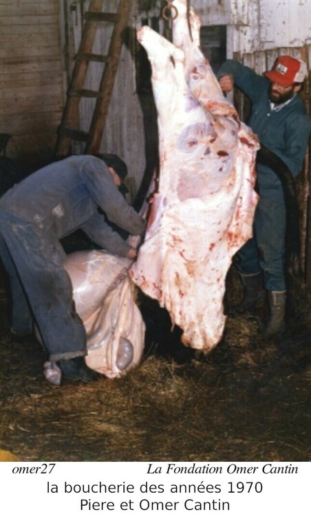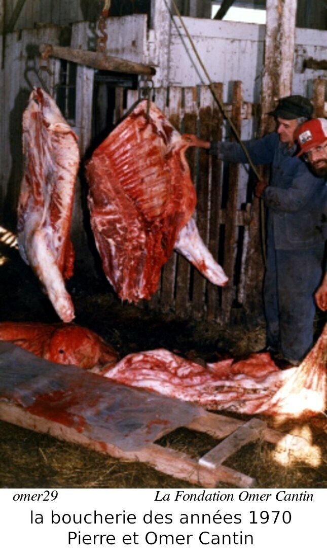 Les poules fournissaient les oeufs (en plus de la viande). Mais elle ne produisaient pas autant l'hiver que l'été. Pour la viande (i.e. le boeuf) un animal était tué à l'automne: c'était le temps de la boucherie. Le fermier tuait et débitait sa viande lui-même. La journée suivant la boucherie, il y avait toujour du boudain sur la table! Nous avons deux photos démontrant la boucherie. Ces photos sont des années 1970, courtoisie d'Omer Cantin, via La Fondation Omer Cantin. On le voit avec Pierre (son père) préparant l'animal et le coupant en quarts.