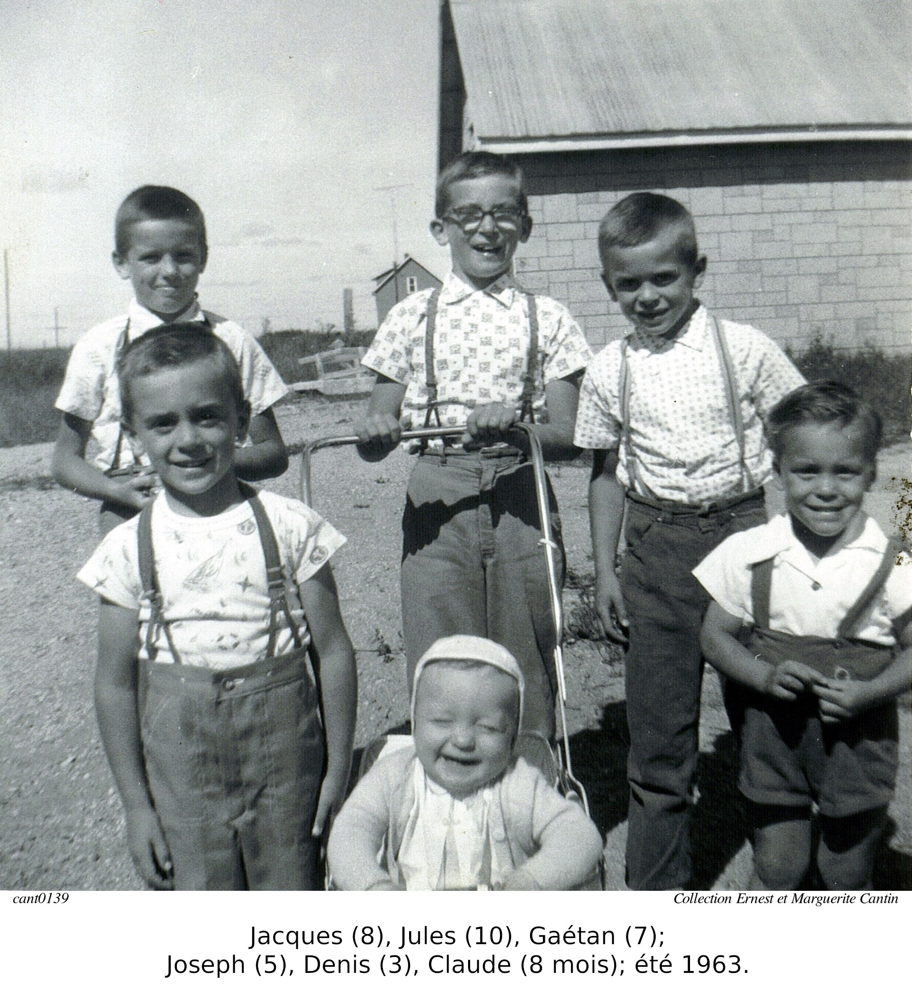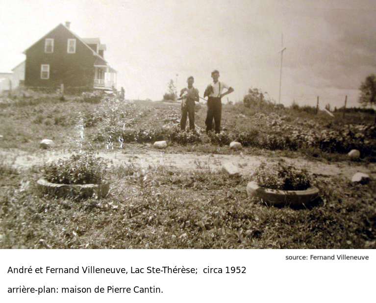 Je me souviens être allé dans cette maison, y célébrer la fête de certains de ses petits enfants (les enfants de mon cousin André), vers la fin des années 1960. La maison fut démolie... fin des années 1960 ou début 1970... Je voudrait porter attention à la photo où l'on aperçoit André et Fernand, les deux garçons de Catherine. Ils sont dans le potager. Dans l'arrière-plan, nous aperçevons la maison de Pierre Cantin. Regardez à la droite de la photo (en face de la maison): nous y voyons une grande croix, près du chemin du Lac. Elle avait été ériger par Alphonsine; c'était comme une profession de foi pour elle. J'ai cherché à trouver quand cette croix fut enlevée. Personne n'a put de donner une date exacte, mais, puisque le chemin du Lac fut refait, plus large, avec de nouveaux fossés, au début des années 1960, j'en déduit que la croix, étant près du chemin original, a dû être enlever pour laisser place à ce nouveau chemin...