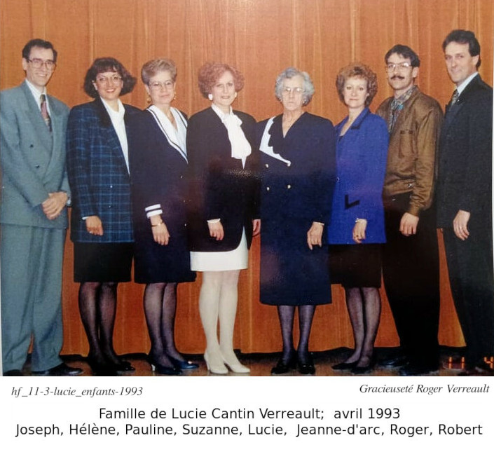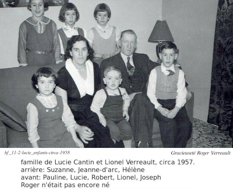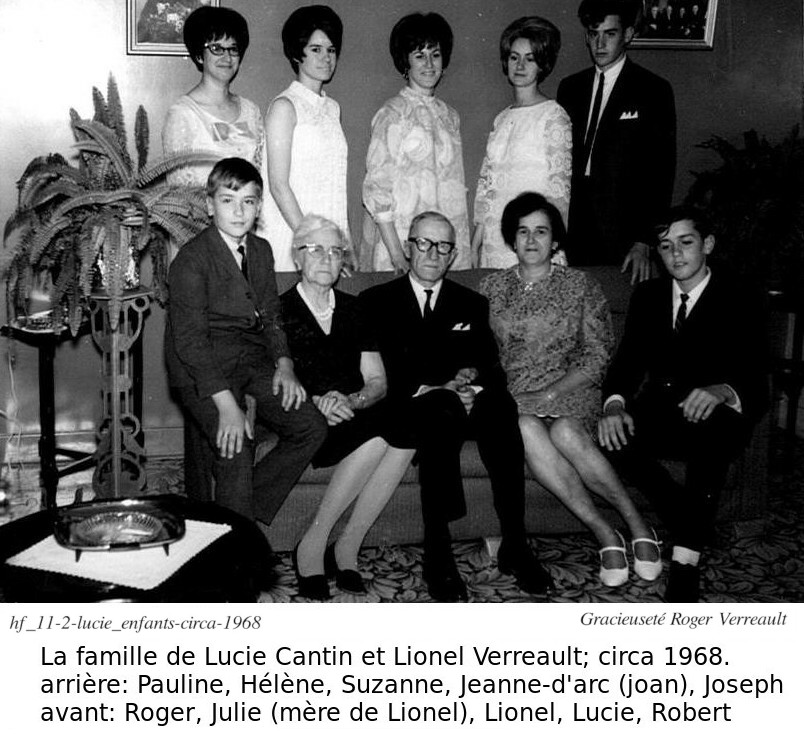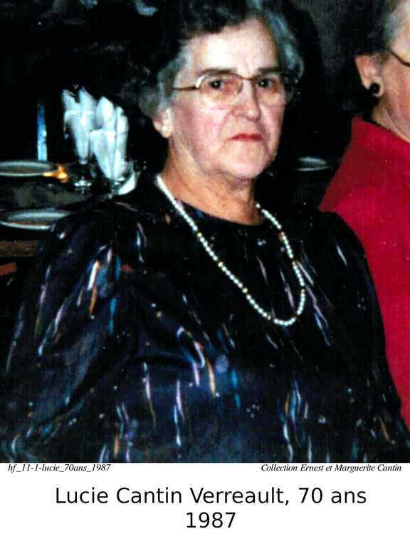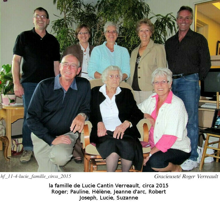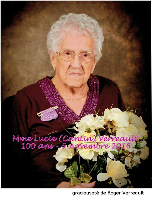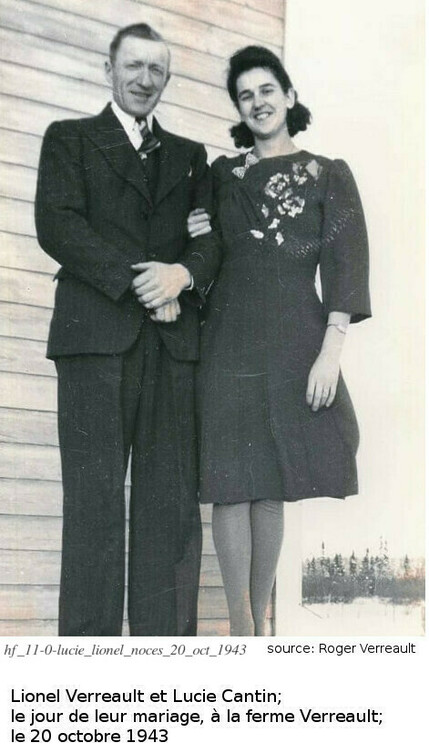 Lucie, parmi les enfants d'Alphonsine, est celle qui a vécu le plus longtemps: 103 ans et 3 mois. Nous avons une photo d'elle alors qu'elle fêtait son centenaire. En décembre 2013, Hélène, une de ses filles, a résumée la vie de sa mère, qui a été active toute sa vie. C'est très interessant à lire; çe n'est pas du temps perdu! ---- Lionel, le mari de Lucie, était menuisier avant de prendre en charge la ferme familiale, qu'il a dévelopée. La ferme Verreault a fournie de ses produits (légumes, volaille, peut-être même du porc) à l'Hôpital Notre Dame. Lionel a été très impliqué dans la formation de la coopérative agricole de Hearst, en plus de la Caisse Populaire. Concernant l'impact de leurs enfants, je peux mentionner que les plus jeunes ont certainement eu une influence positive sur l'économie de la région.
