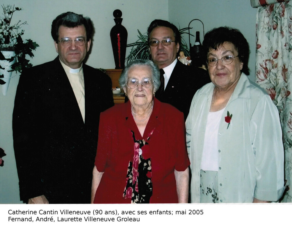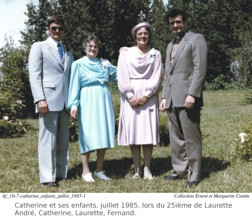 Après son travail au collège, Catherine a "suivit" Fernand dans sa prêtrise, avant de se retirer. Elle a bonne plume. Dans le milieu des années 1990, elle rédige un document de 54 pages, "Témoingnage de vie", une autobiographie. Tout comme Marie, la plupart de ses enfants se sont lancés dans l'éducation; à son mariage, Laurette est déménagée à la ferme Groleau, de Coppell. André m'a enseigné (éducation physique), à l'école Saint Louis!