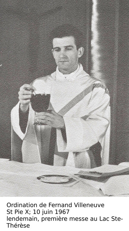 Mais celui que le plus grand nombre des gens de Hearst connaissent est l'abbé Fernand Villeneuve. Il fut ordonné prêtre le 10 juin 1967, à l'église St Pie X; le lendemain, il disait sa première messe, à l'église du Lac Ste-Thérèse. Je fut servant de messe pour lui, dans cette même église. Fernand a présidé plusieurs messes spéciales dans ma famille. Il a présidé le 50ième anniversaire de marriage de mes grand-parents Pominville en 1973, le mariage de Jules (le plus vieux chez nous) en 1976, et même les funérailles de mes parents (mon père, en 1997, et ma mère, en 2020).