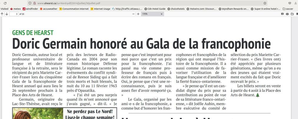 Doric Germain a enrichie le vocabulaire de plusieurs, avec la publication de ses cinq livres. Qui n'a pas lu "La vengeance de l'orignal" dans les pages du journal Le Nord? Certains de ses livres sont utilisé dans les écoles franco-ontariennes dans les cours de litératures françaises. En 2014, Doric fut honoré au Gala de la francophonie en reçevant le pix Mariette Carrrier-Fraser. Ce gala a comme but d'honorer les francophone et francophiles de la région qui ont marqué l'histoire de la francophonie (journal Le Nord; voir photo inclus).
