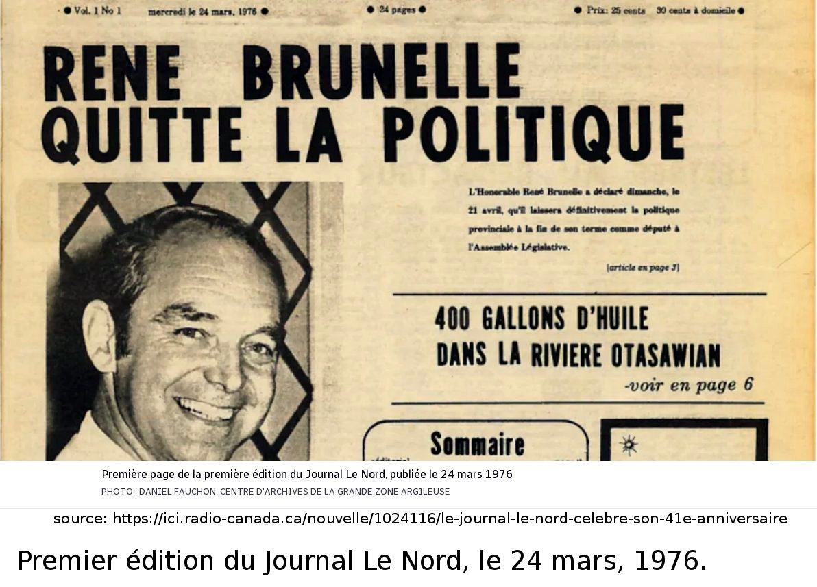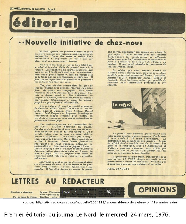 Retournons au début. En 1975, la graine pour la création d'un journal francophone à Hearst est semée par Paul Tanguay et Raymond Tremblay. Une équipe de volontaire comprenant Gilles Camiré, Omer Cantin, Joseph Dubé, Laurent Guidon, Henri Leclerc, Marcel Leclerc, ainsi que Paul Tanguay et Raymond Tremblay, travaillent ensemble pour vendre des actions, pour amasser assez d'argent pour partir le journal (je me souviens quand ils sont venus chez nous pour vendre des actions à mon père). La campagne a réussi, puisque le mercredi 24 mars 1976, la première copie du journal est distribuée dans la région de Hearst. Son équipe est composé d'Omer Cantin, journaliste, de Paul Tanguay, rédacteur en chef et publiciste, de Louise Tanguay, responsalbe de la mise en page, et de Gilles Camiré, responsable de l'administration.