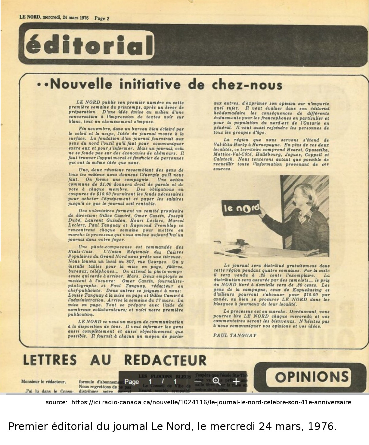 Nous avons une photo du la première édition du journal Lenord, celui du mercredi 24 mars, 1976. Nous avons aussi une photo du permier éditorial du journal.