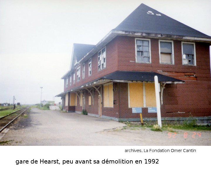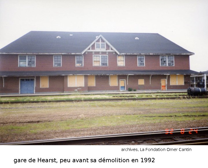Le Centre d'archives de la Grande Zone argileuse, contient, dans ses nombreuses archives, de nombreau documents, dont plus de 1200 diapositives concernant la société historique de Hearst et de la région. J'ai utilisé la description des archives de la société historique pour m'aider à rédiger cette page. Nous avons plusieurs photos de la gare de Hearst, depuis sa construction, jusqu'à l'année de sa démolition. Le point focal de cet article est l'impact qu'Omer a eut sur la région de Hearst, et non la gare de Hearst. Voici deux photos de la gare, peu avant sa démolition, en 1992, des archives de La Fondation Omer Cantin. Pour garder notre point focal à la bonne place, nous n'avons inclue que deux photos de la gare, peu avant sa démolition, en 1992. |