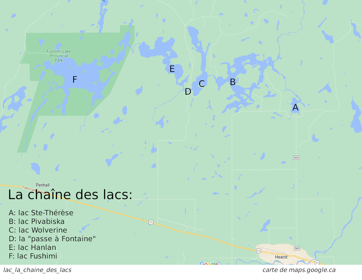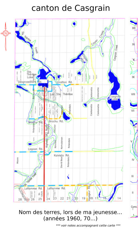 Avant de continuer, je dois avouer que certains détails dans les dires d'Yvonne n'étaient pas très clairs. Par exemple, elle mentionne un "restaurant sur la terre de son frère" (plus bas). Pourtant, la terre dont elle parle semble être EN FACE du restaurant dont elle mentionne. J'ai eu une discussion avec Omer Cantin, "historien extra-ordinaire" du Lac, et il est d'accord avec moi que certaines choses restent à être élucidées. Mais il faut aussi penser qu'Yvonne avait 9 ans lorsqu'elle est venue à Hearst, et qu'elle s'est mariée à 17 ans. Toutes ses choses se passaient avant son premier mariage, et l'entrevue qu'elle a donnée était en 1977. 60 ans plus tard, notre mémoire n'est pas toujours infaillible.