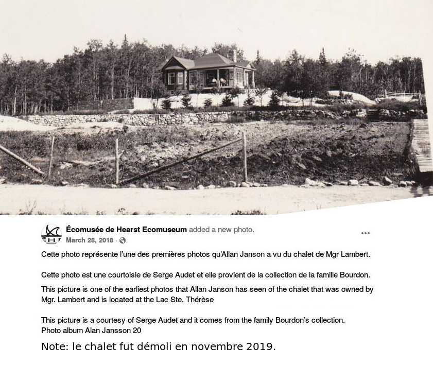 Note: à l'intérieur de ces pages, "le chalet de Mgr. Lambert" dénotera cette maison. En réalité, comme mentionné ci-haut, la terre, et la maison, appartenait à Joseph Lambert. Mgr. en a hérité lorsque son père est décédé, suivit par la familler Séguin (Marie a marié dans la famille Séguin, donc ça reste quand-même dans la famille...). Quelques autres propriétaires plus tard, nous l'apèlerons quand même "le chalet de Mgr. Lambert". Continuons avec l'abbé Lambert. L'abbé Lambert occupa plusieurs postes administratifs à l'intérieur de diocèse. Par exemple, il fut nommé superintendant de la construction de l'école Ste-Thérèse (celle de Hearst, pas celle du Lac) en mars 1929. Cette école de huit classes deviendra rapidement l'école principale pour les catholique français de la ville de Hearst. L'abbé Lambert fut longtemps directement impliqué à l'éducation catholique française de la région. Pourquoi mentionner Mgr Lambert dans ce texte? C'est parce que l'un des édifice qui a survécu pour plus de 80 ans au Lac Ste-Thérèse fut bâtit par sa famille -- pour ceux qui ont grandi au Lac, c'était "le chalet de Monseigneur Lambert". Certe, il a changé de propriétaire depuis, mais ce nom y est resté surtout pour les personnes qui ont grandit au Lac jusque dans les années 1990. Jusqu'à sa démoliton le 26 novembre 2019, c'était le plus vieux bâtiment au Lac. J'inclue ici trois photos du site du chalet de la famille Lambert: la première prise dans les années 1930 ou 1940, une autre juste avant sa démolition en 2019, et enfin, le nouveau chalet sur le même site, en 2022. Mgr Lambert (l'abbé Lambert dans ce temps-là) est aussi le premier prêtre à dire une messe au Lac Ste-Thérèse.