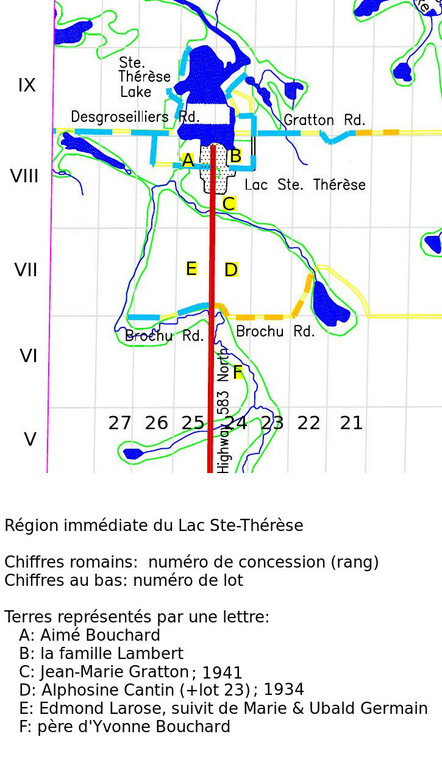 Note: la terre juste au sud de celle d'Alphonsine Cantin (lot 24, concession V) est l'une de ces terres. Les Bouchard ont achetés circa 1921; Alphonsine Cantin est arrivée en 1934.