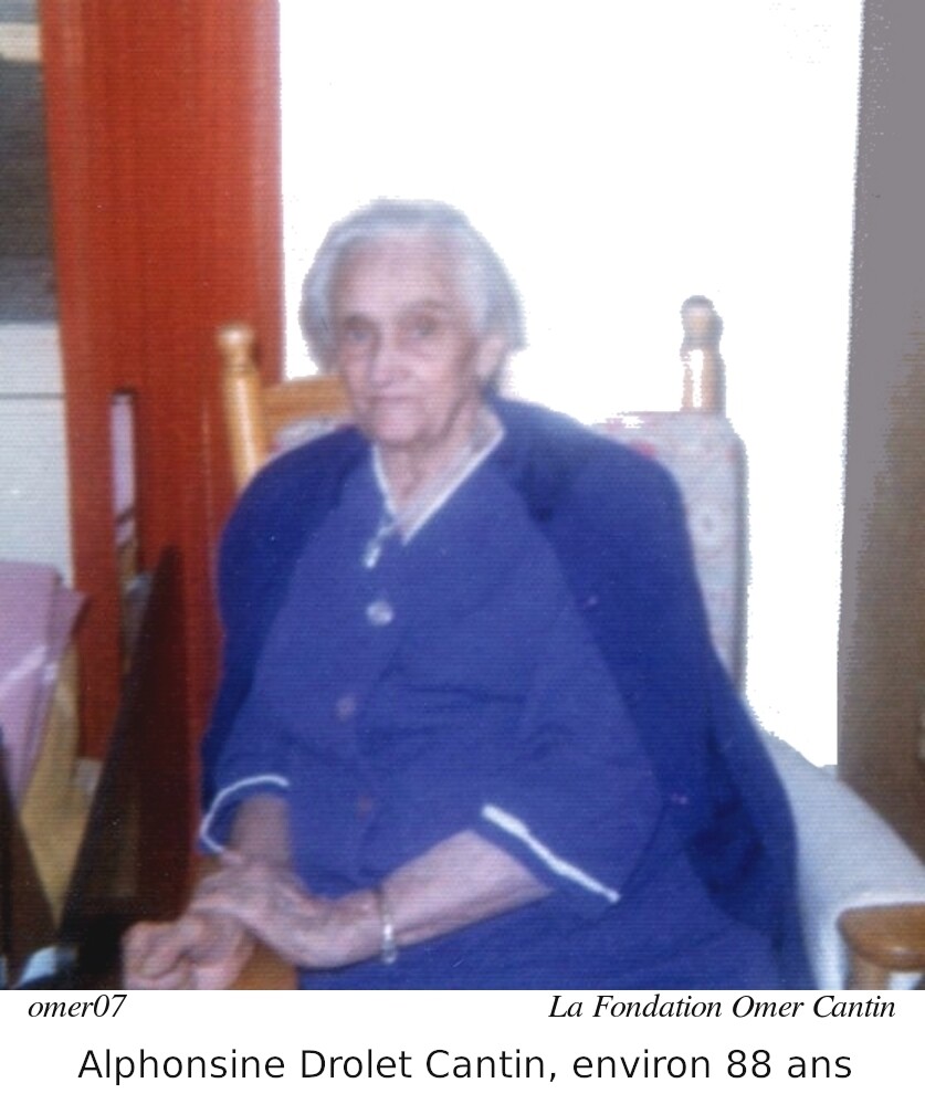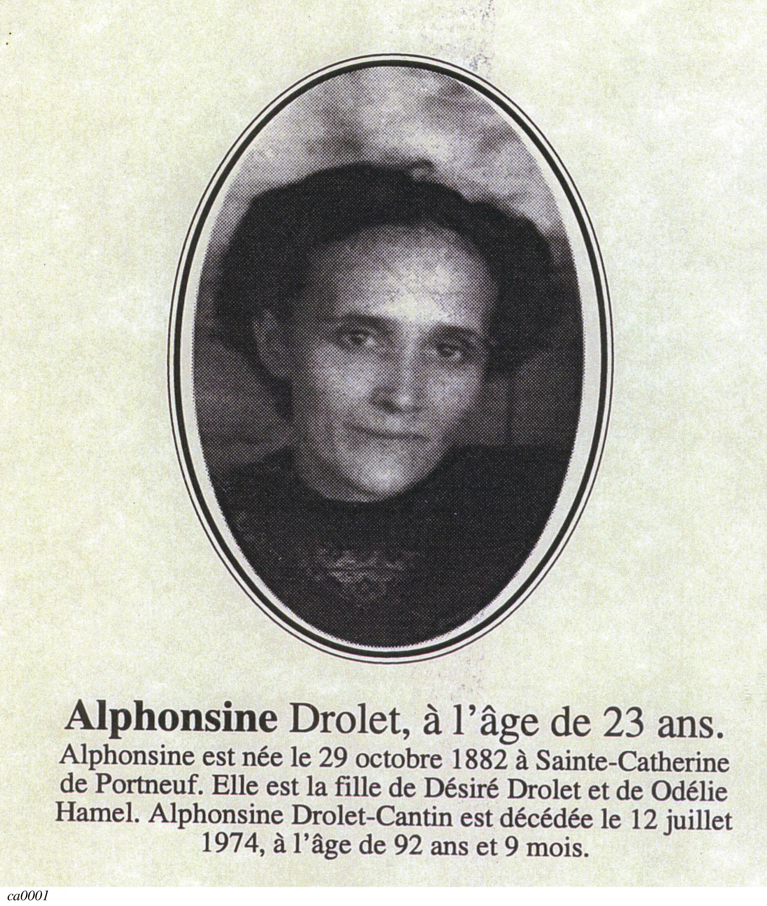 Pour celui d'Alphonsine Drolet, elle me fut parvenue par Gemma Cantin Boucher (ma cousine, fille de Lucien Cantin).