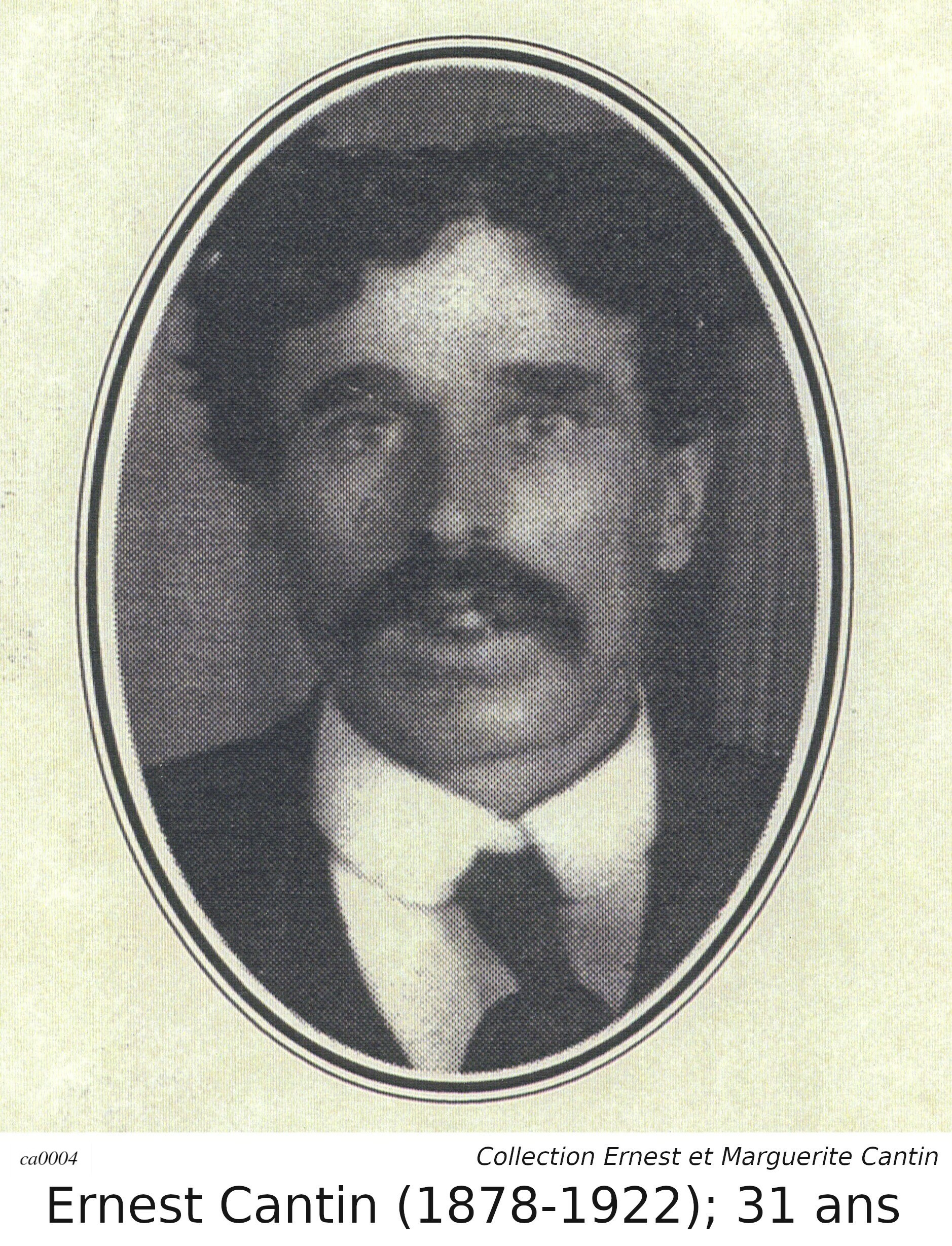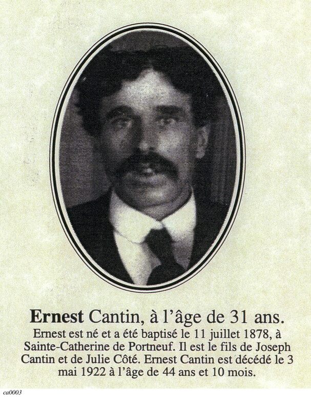 Notre dernier ancêtre demeurant au Québec, Ernest Cantin (père), fils de Joseph, se maria avec Alphonsine Drolet le 2 mai 1905. Alphonsine lui donna 13 enfants (détails plus tard).
