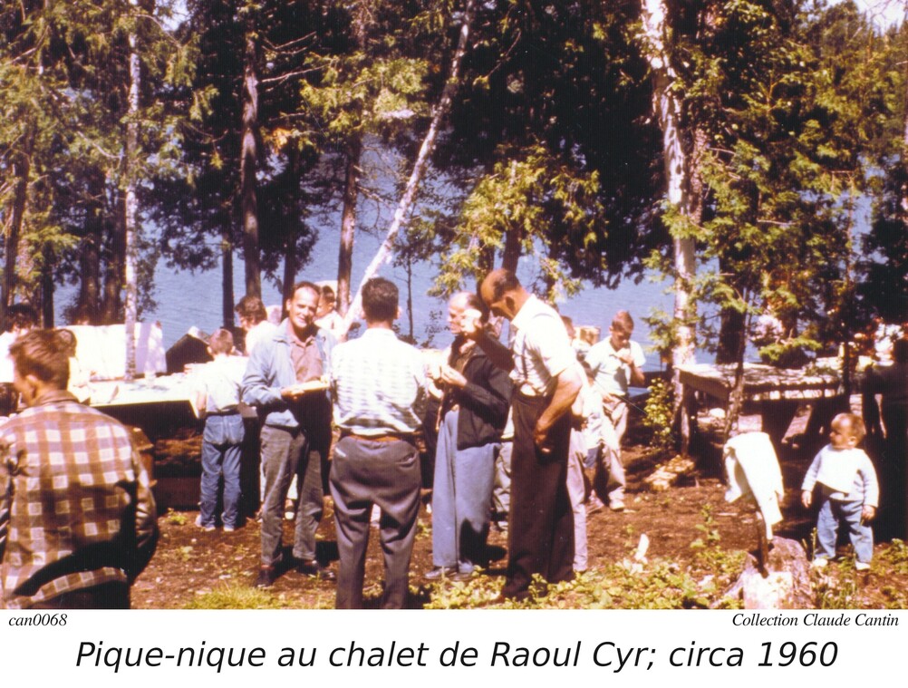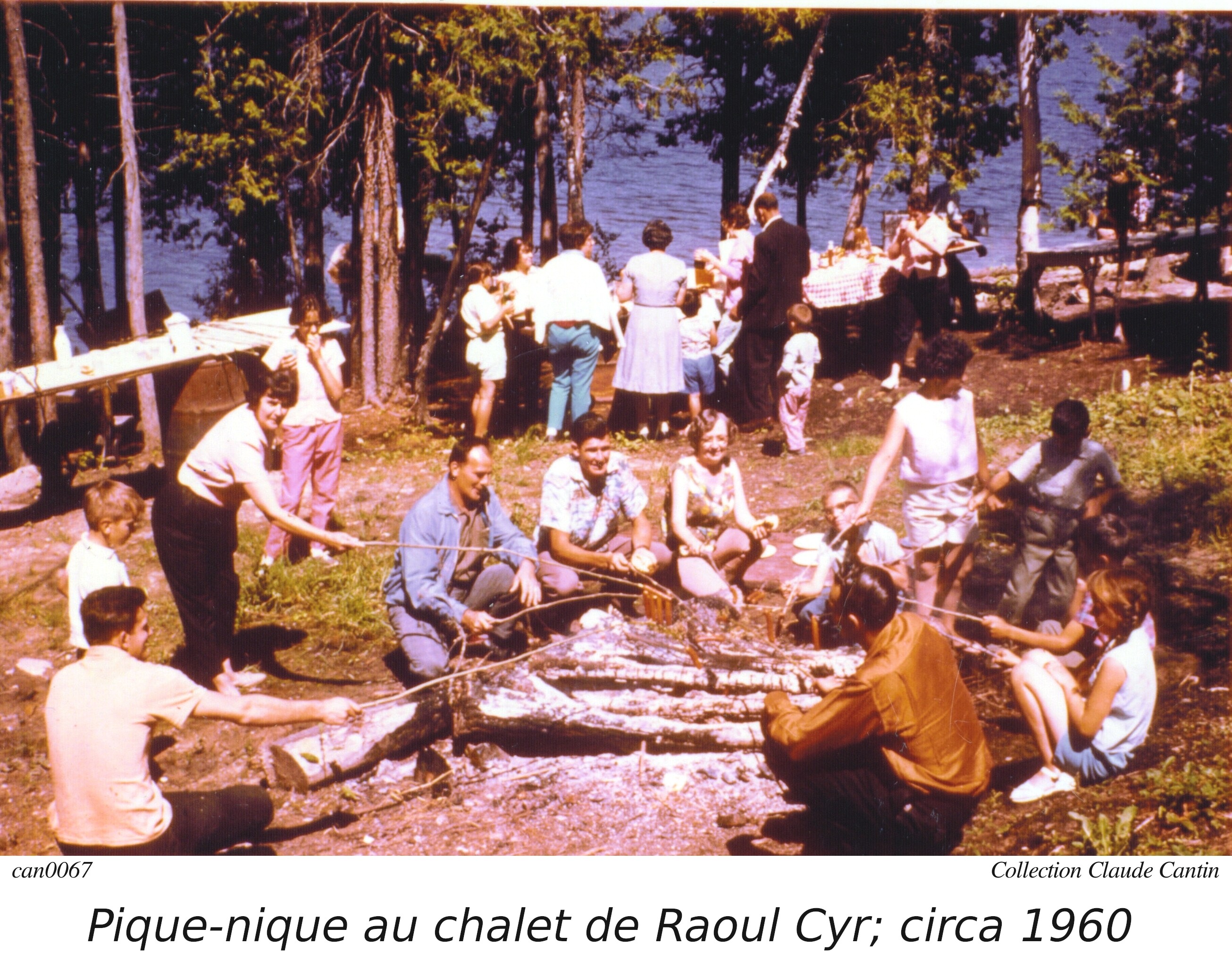 Lors d'un pique-nique familial, au chalet de Raoul Cyr au Lac Ste-Thérèse (Laurette, chez Marie, avait mariée Raoul Cyr), circa 1960, nous y voyons plusieurs membres de la famille grillant des saucisses.
