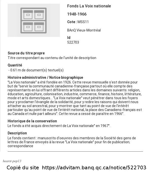 Au début des années 1930, spécifiquement en 1932, un "Congrès national de Colonisation" était tenu à Montréal. Un extrait des rapport présentés à ce congrès est disponible au https://numerique.banq.qc.ca/patrimoine/details/52327/2561295?docref=4saJvDhpEPz3UVG5tKO8eg. La page titre nous apparait sur cette page. Nous avons aussi une version local de ce rapport. Le but de ce congrès était de démontrer que la colonisation "canadienne" (i.e. catholique française) était nécessaire pour la survie de "sa race" (expression ouverte à interprétation, selon le contexte des années 30)... En même temps, la revue mensuelle "La Voix Nationale" encourageait les Québécois à aller s'installer au nord de l'Ontario, où des terres arables étaient mises à la disposition des colons. L'Eglise Catholique française encourageait fortement ses fidels à y aller, afin de s'assurer la colonisation du nord de l'Ontario par les canadiens-français, avant que d'autres groupes s'approprient cette région. Cette poussée du clergé québécois, couplé avec la crise économique des années 1930, a su encourager plusieurs fermiers québécois à venir dans la région de Hearst et de se procurer des terres. Nous verrons plus tard que mes grand-parents paternels ET maternels sont venu dans la région grâce à ce marketing du clergé québecois, via La Voix Nationale. Nous verrons même qu'Alphonsine Cantin, ma grand-mère avait écrit un article, une lettre, dans cette revue...