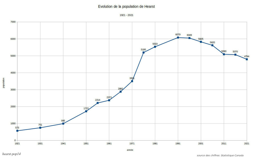 La page wikipédia https://fr.wikipedia.org/wiki/Hearst_(Ontario) nous donne un aperçu de l'évolution de la population de Hearst, de 1921 à 2011. Dans le tableau et le graphique ci-dessous, j'y ai ajouté celle des recenssement de 1931, 1956, 1966, 1971, 1976, 2016 et 2021, en cherchant sur le site de statistique canada et sur le site d'archive.org (https://archive.org/details/1971927021973engfra/page/n61/mode/2up?q=hearst). Le recensement de 1971 mentionne que Hearst avait annexé une partie des territoires non-organisés, mais ne mentionne pas lesquels.