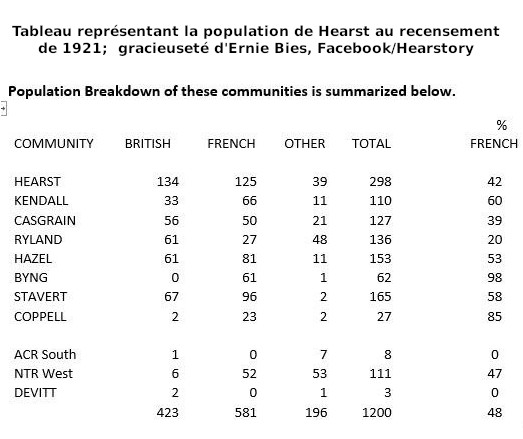 Par contre, le recensement de 1921 comprend les cantons environnant -- Ritchie, Casgrain, Kendall, Sheltland, Okney, Caithness, Rykert, Magladerry, Staunton, Devitt, Shannon, Mulvey et Hearst. Ernie Bies, dans Facebook/Hearstory, a publié certains détails du recensement de 1921 de la région de Hearst. Son tableau indique le nombre de personnes de différentes nationalitées dans la ville de Hearst, et dans certains des cantons de la région. Son exposé nous révèle que la porportion francophone de la région de Hearst était, en 1921, d'environ 50%. Dans le conton de Casgrain, où les Cantin se sont établit en 1934, 39% des 127 personnes recenssées étaient d'origine francophone. Pour Kendall, où les Pominvilles (du côté de ma mère) sont arrivés en 1937, 60% des 110 habitants étaient d'origine francophone. En 1922, année de l'incorporation de Hearst, la population était de 573 personnes (http://www.hearst.ca/wp-content/uploads/2016/04/Hearst-bref-historique-3-.pdf) version locale.