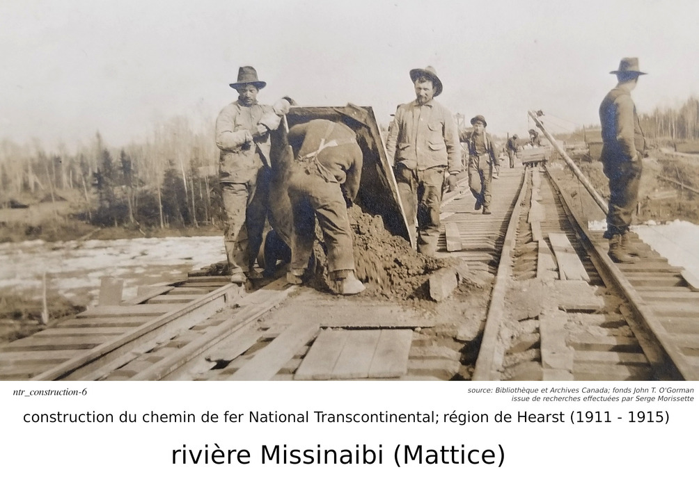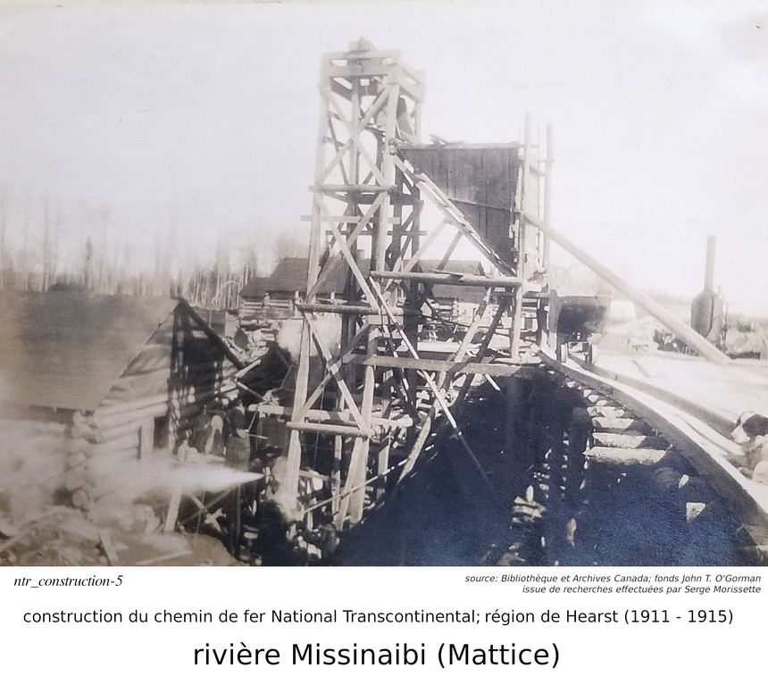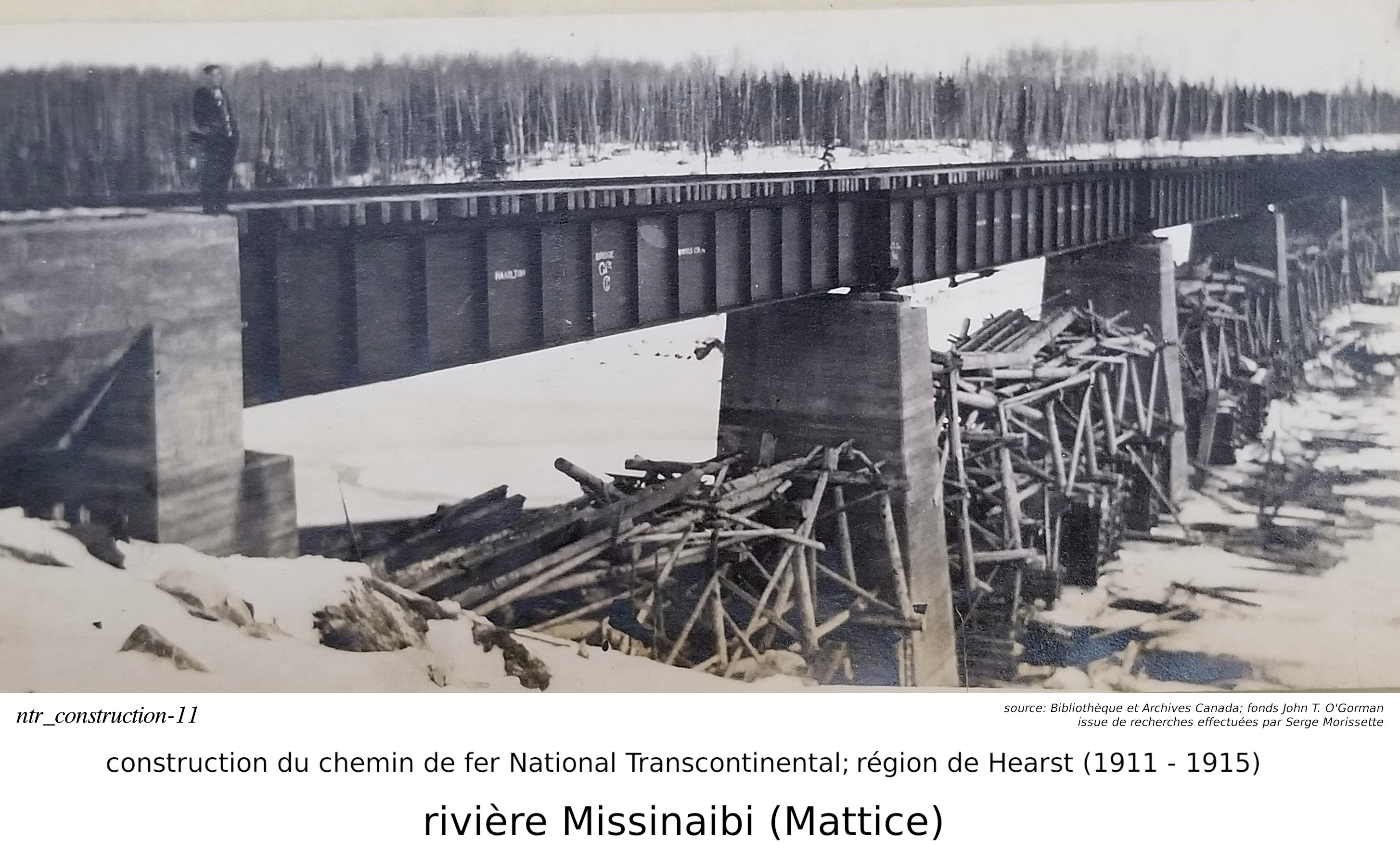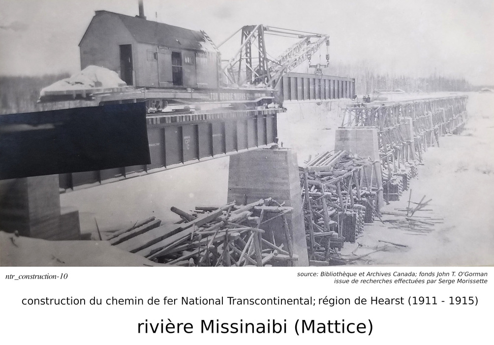 Parlons maintenant de la construction du chemin de fer National Transcontinental (des techniques similaires aurraient aussi été utilisées pour construire l'Algoma Central), illustrée par des photos trouvées par Serge. Notre discussion commence par le pont de la National Transcontinental, traversant la rivière Missinaibi, à Mattice (pour ceux que ne savent pas, Mattice est une petite communauté situé sur la route 11, à 30 kilomètres à l'est de Hearst).