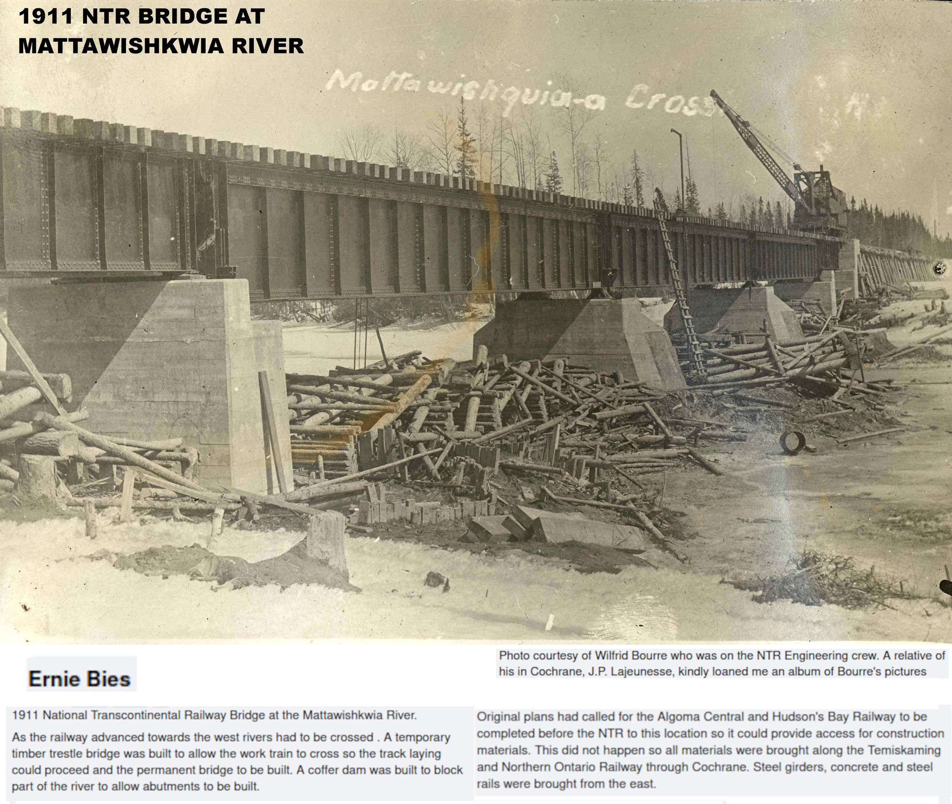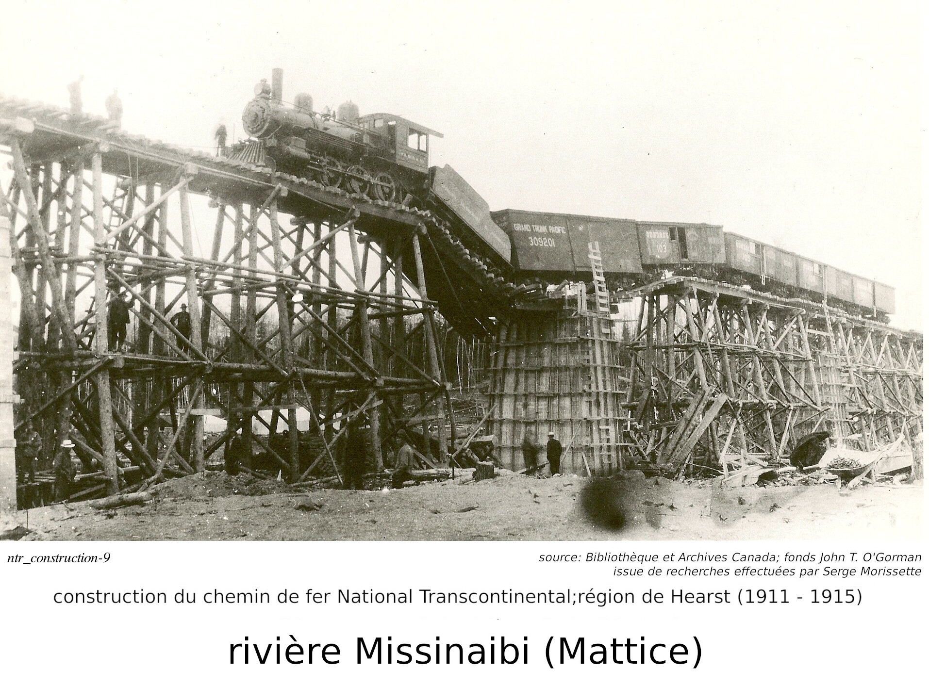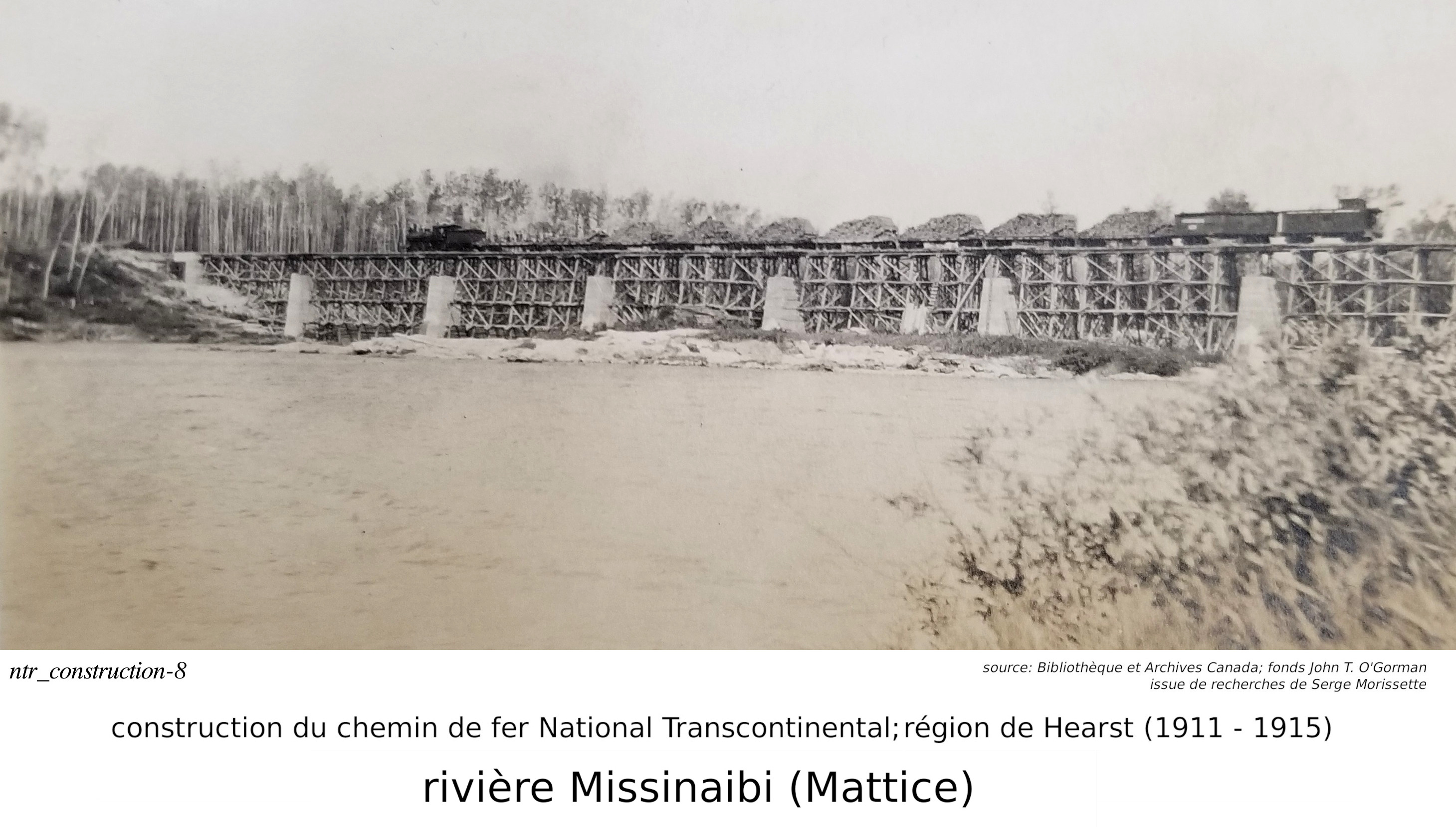 Parlons maintenant de la construction du chemin de fer National Transcontinental (des techniques similaires aurraient aussi été utilisées pour construire l'Algoma Central), illustrée par des photos trouvées par Serge. Notre discussion commence par le pont de la National Transcontinental, traversant la rivière Missinaibi, à Mattice (pour ceux que ne savent pas, Mattice est une petite communauté situé sur la route 11, à 30 kilomètres à l'est de Hearst).