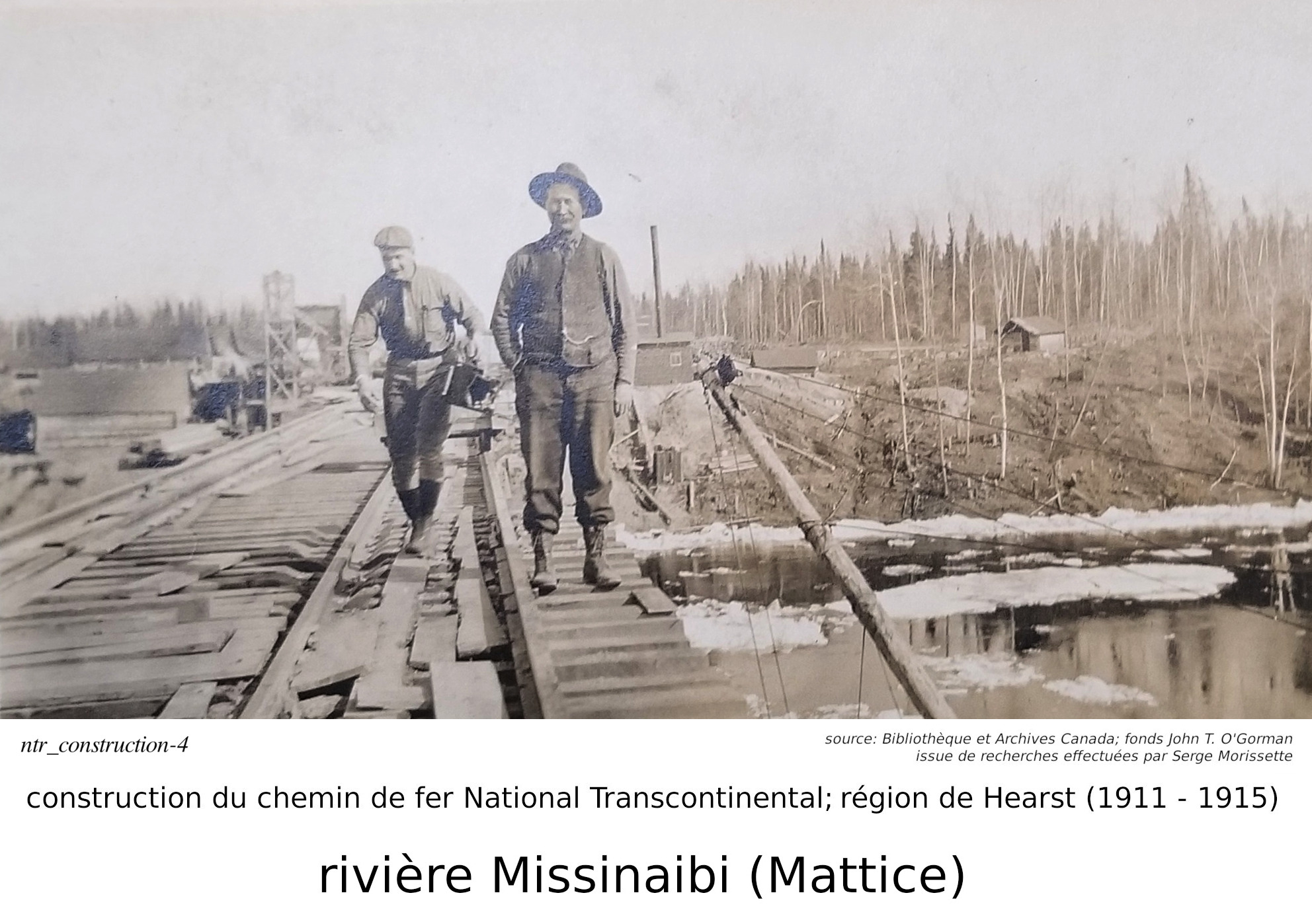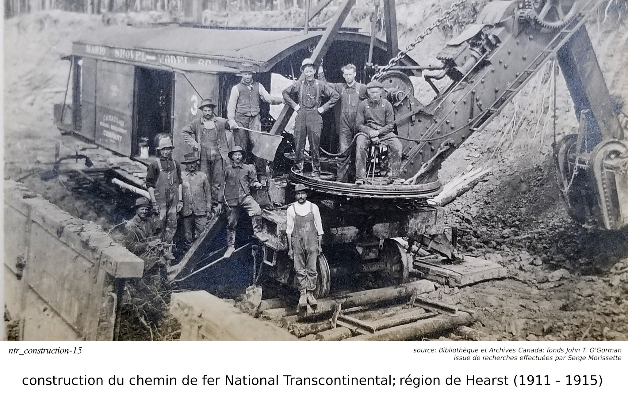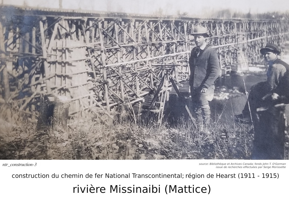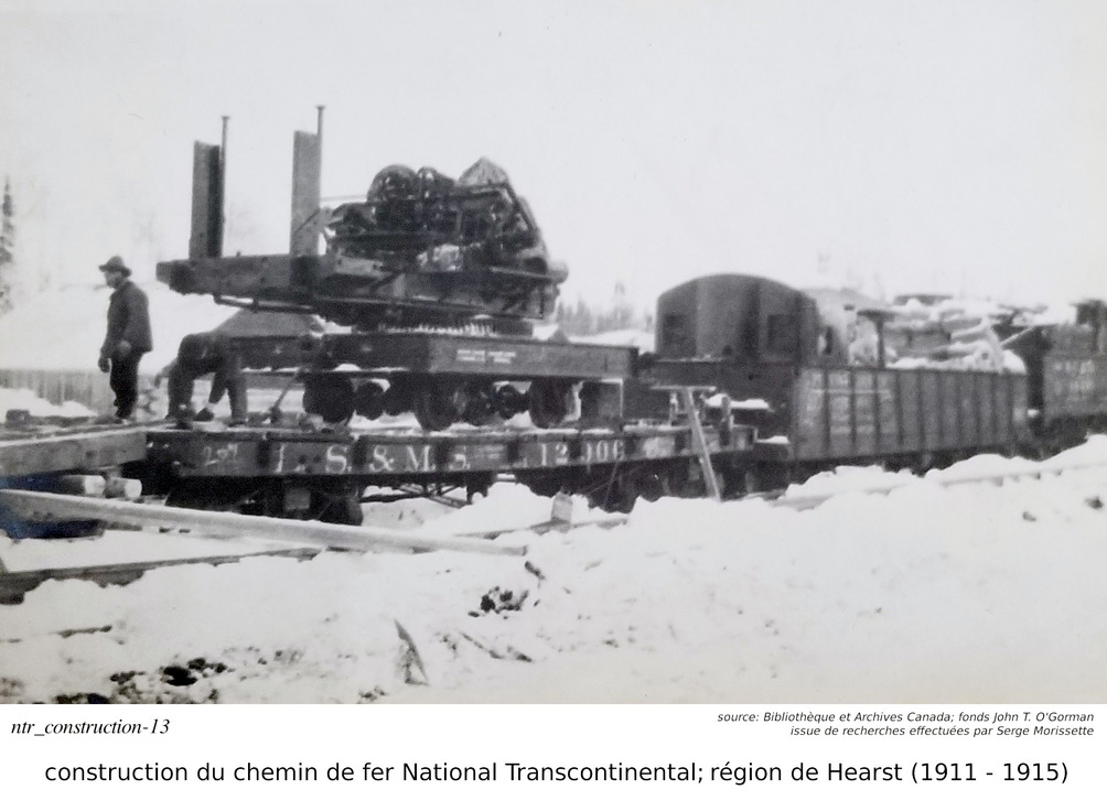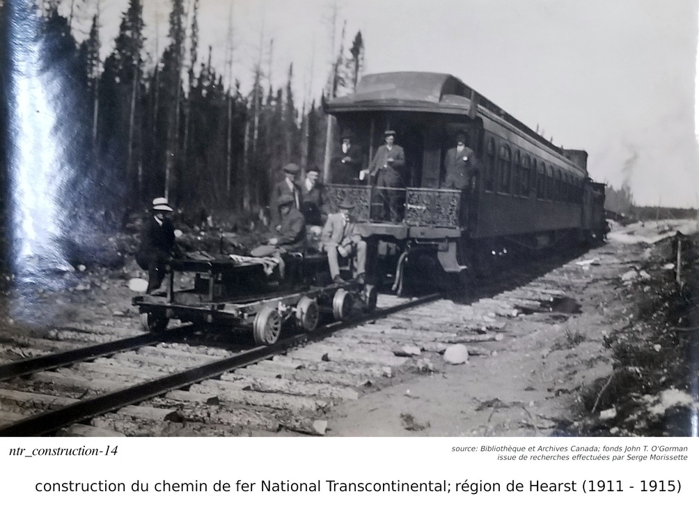 Serge Morissette, dans Facebook/Hearstory, a publié une série de quatres articles sur la construction de la National Transcontinental, plus spécifiquement sur le tronçon incluant la ville de Hearst. Dans ses articles, Serge nous dit que la construcution du tronçon du chemin de fer National Transcontinental dans la région de Hearst ("contrat #16, du District E") fut éventuellement effectuée par un partenariat entre les hommes d'affaires O'Brien, McDougall et O'Gorman. Accompagnés de plusieurs photos, qu'il a retrouvé à la Bibliothèque et Archives Canada, faisant parties des fonds John T. O'Gorman (l'un des trois partenaires!), il nous parle non seulement de la construction du chemin de fer, mais aussi de l'homme d'affaire Michael J. O'Brien, son portefeuille, et, pour les amateurs de hockey, de son influence sur la création de la Lignue National de Hockey... C'est une mine d'or que Serge a découver à la Bibliothèque et Archives Canada. J'ai personellement contacté Bibliothèque et Archives Canada, par curiosité, parce que je voulais savoir pourquoi cette série de photos nous provenaient du "fonds" John t. O'Gorman.