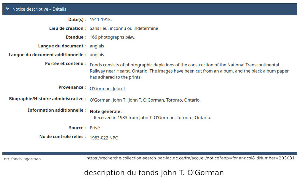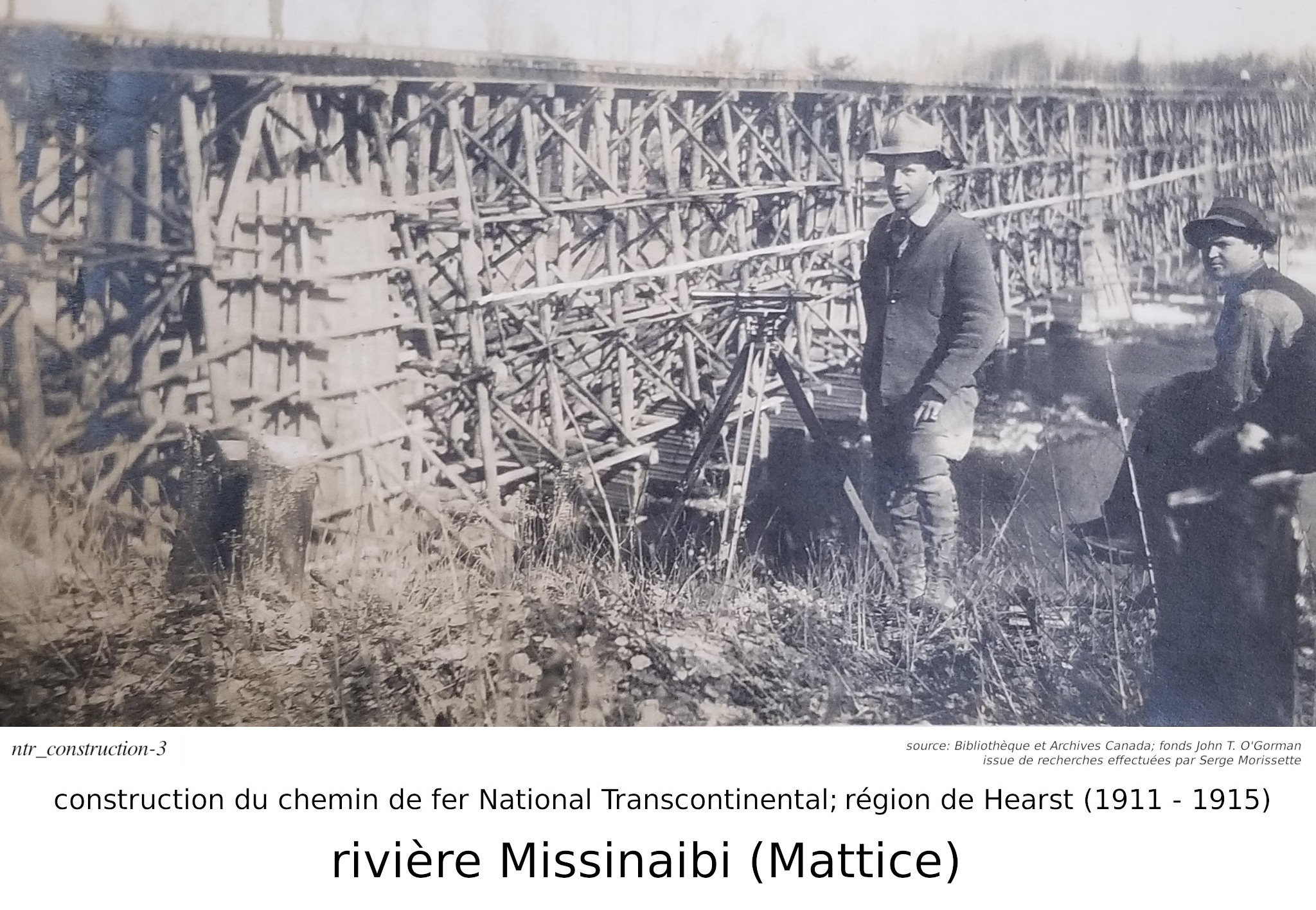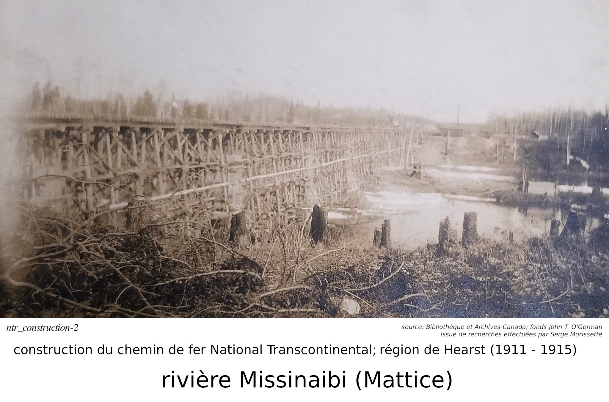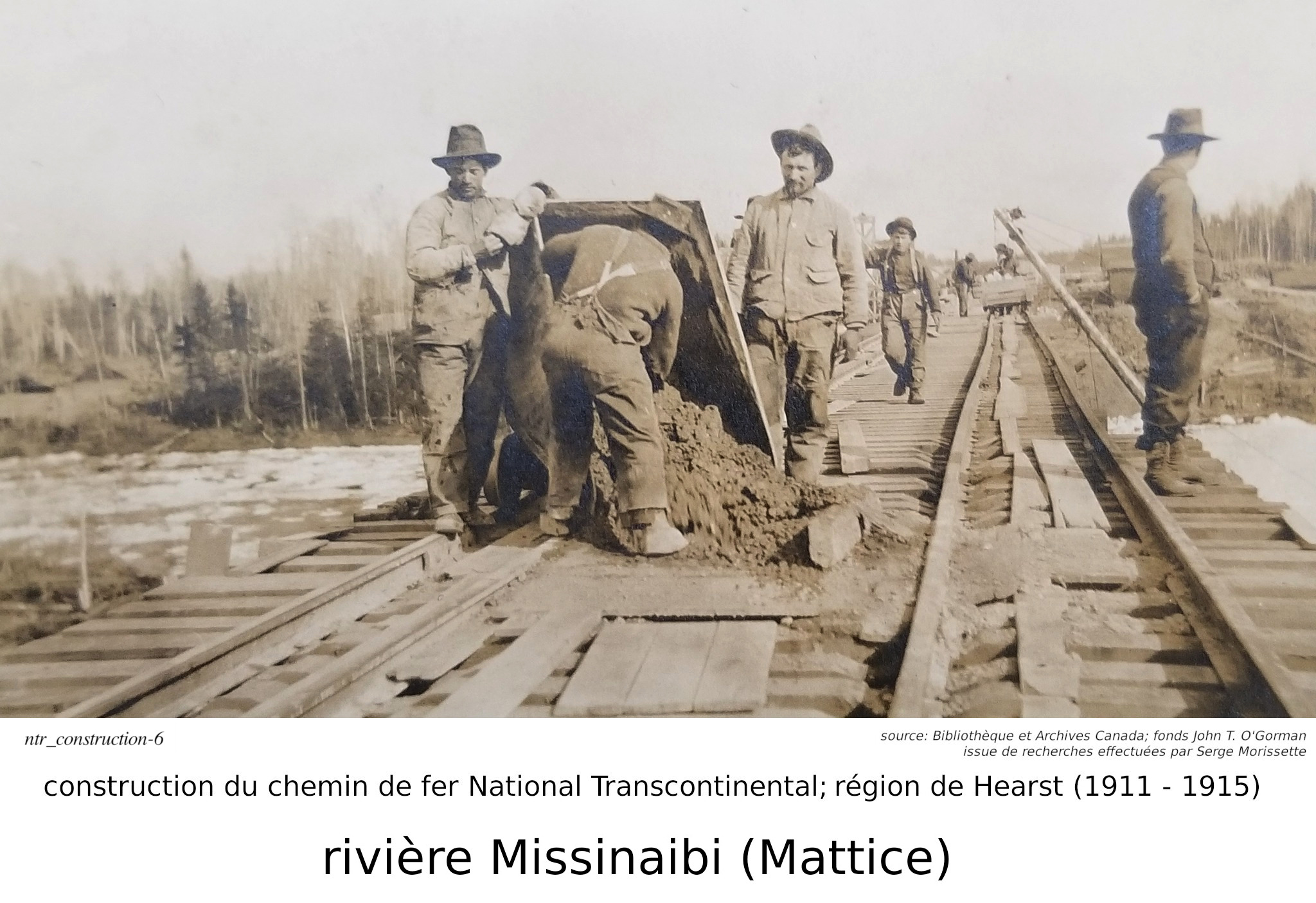 Serge Morissette, dans Facebook/Hearstory, a publié une série de quatres articles sur la construction de la National Transcontinental, plus spécifiquement sur le tronçon incluant la ville de Hearst. Dans ses articles, Serge nous dit que la construcution du tronçon du chemin de fer National Transcontinental dans la région de Hearst ("contrat #16, du District E") fut éventuellement effectuée par un partenariat entre les hommes d'affaires O'Brien, McDougall et O'Gorman. Accompagnés de plusieurs photos, qu'il a retrouvé à la Bibliothèque et Archives Canada, faisant parties des fonds John T. O'Gorman (l'un des trois partenaires!), il nous parle non seulement de la construction du chemin de fer, mais aussi de l'homme d'affaire Michael J. O'Brien, son portefeuille, et, pour les amateurs de hockey, de son influence sur la création de la Lignue National de Hockey... C'est une mine d'or que Serge a découver à la Bibliothèque et Archives Canada. J'ai personellement contacté Bibliothèque et Archives Canada, par curiosité, parce que je voulais savoir pourquoi cette série de photos nous provenaient du "fonds" John t. O'Gorman.