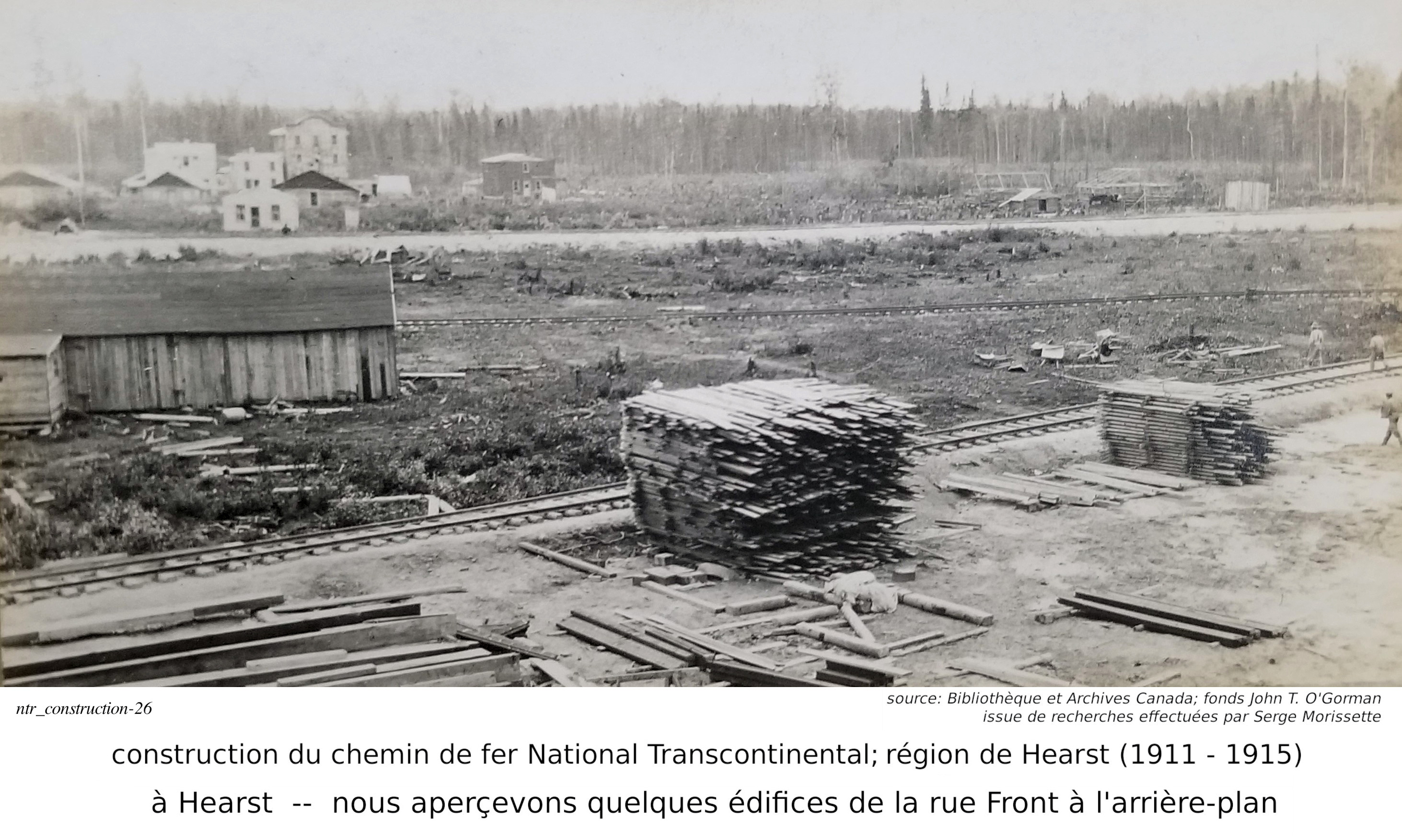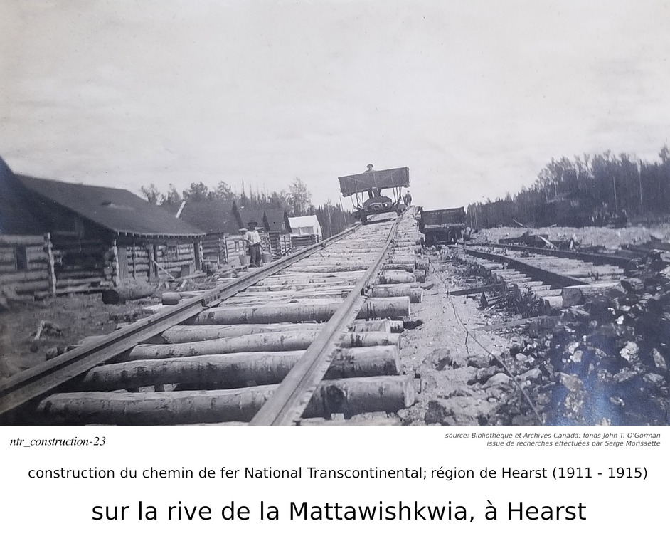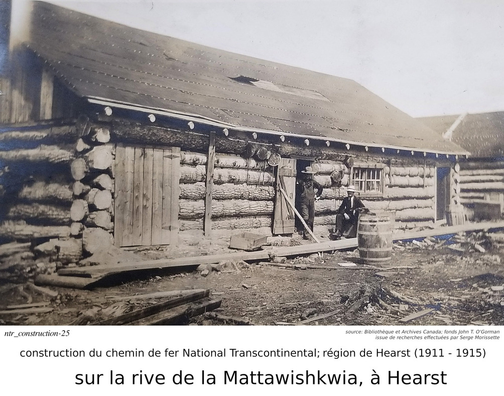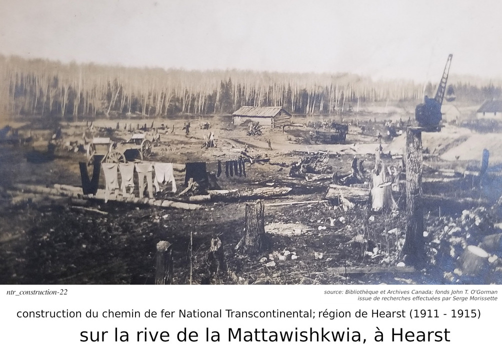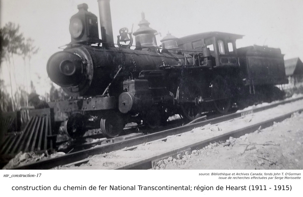 Je m'arrête sur le mot "fonds". Quelques jours après ma requête, j'ai reçu une réponse au-delà de mes espérances. Non seulement est-je reçu une réponse à l'intérieur de quelques jours, mais l'information reçu était très intéressante. Je vous le partage ici. Dans le monde de l'archivage, le mot "fonds" est synonyme à une collection. Donc, lorsque l'on dit que les photos font parties du "fonds" John T. O'Gorman, ça veut dire qu'elle font parties de sa collection personnelle. Dans ce cas-ci, la collection, ou le fonds, consiste en 166 photos données aux Archives Nationales du Canada en 1983, par John T. O'Gorman, le personne qui a pris (ou à qui appartenait) ces photos! Bibliothèque et Archives Canada m'a fait parvenir ce lien, qui décrit le fonds John T. O'Gorman. J'en ait produit la description ci-contre. De retour à Serge et à ses publications. Dans Facebook/Hearstory, Serge a publié environ une centaines de ses photos. J'en publi ici moins d'une trentaine, la plupart dans cette section de construction du chemin de fer, mais j'en ai aussi une dans la section de la gare de Hearst, et quelques unes dans la section de la rotonde, près de la gare. J'ai dû me retenir... j'ai été tenté d'en produire beaucoup plus, mais je crois qu'avec ceux publiées ici, j'ai atteint le but que je m'était fixé... celui de démontrer la contruction du chemin de fer, dans la région de Hearst. Je répète que Serge est celui qui a découver cette mine d'or. Je n'est fait que lui "emprunter" ces photos, les organisées différement, et ajouté des commentaires, basé sur mon interprétation de ces photos. Bien sur, certains des commentaires dans Facebook/Hearstoy, m'ont aussi aidé à formuler mes conclusions. ==== Nous avons déjà mentionné que Hearst était un centre divisionaire, donc une centre ferroviaire assez important, comportant une gare plus grande et des installations pour la réparation et la maintenance de locomotives, comportant une rotonde et une table tournante. Nous discuterons de la gare, et de la rotonde dans quelques lignes.