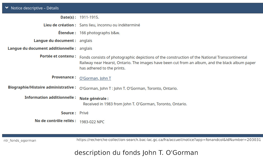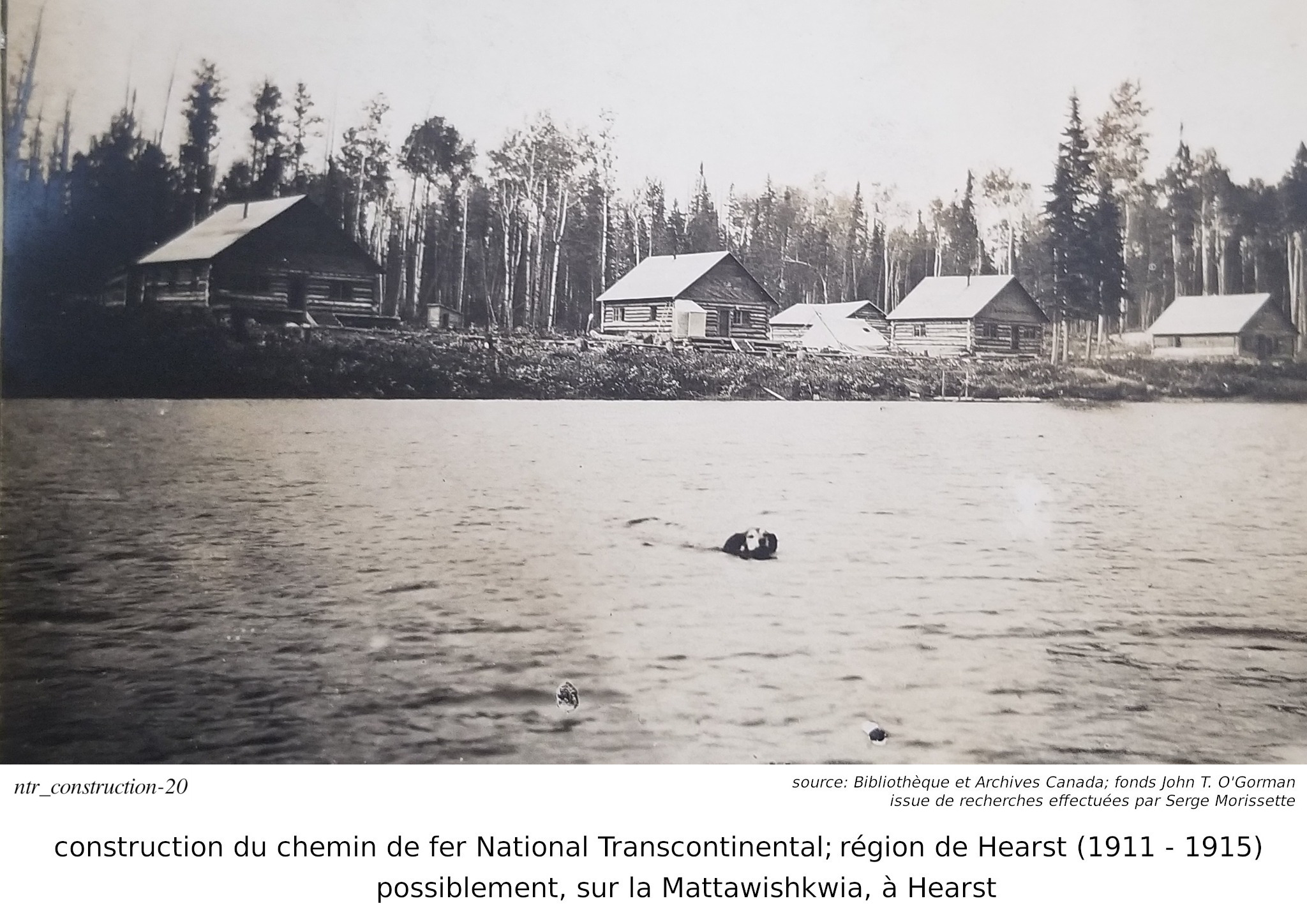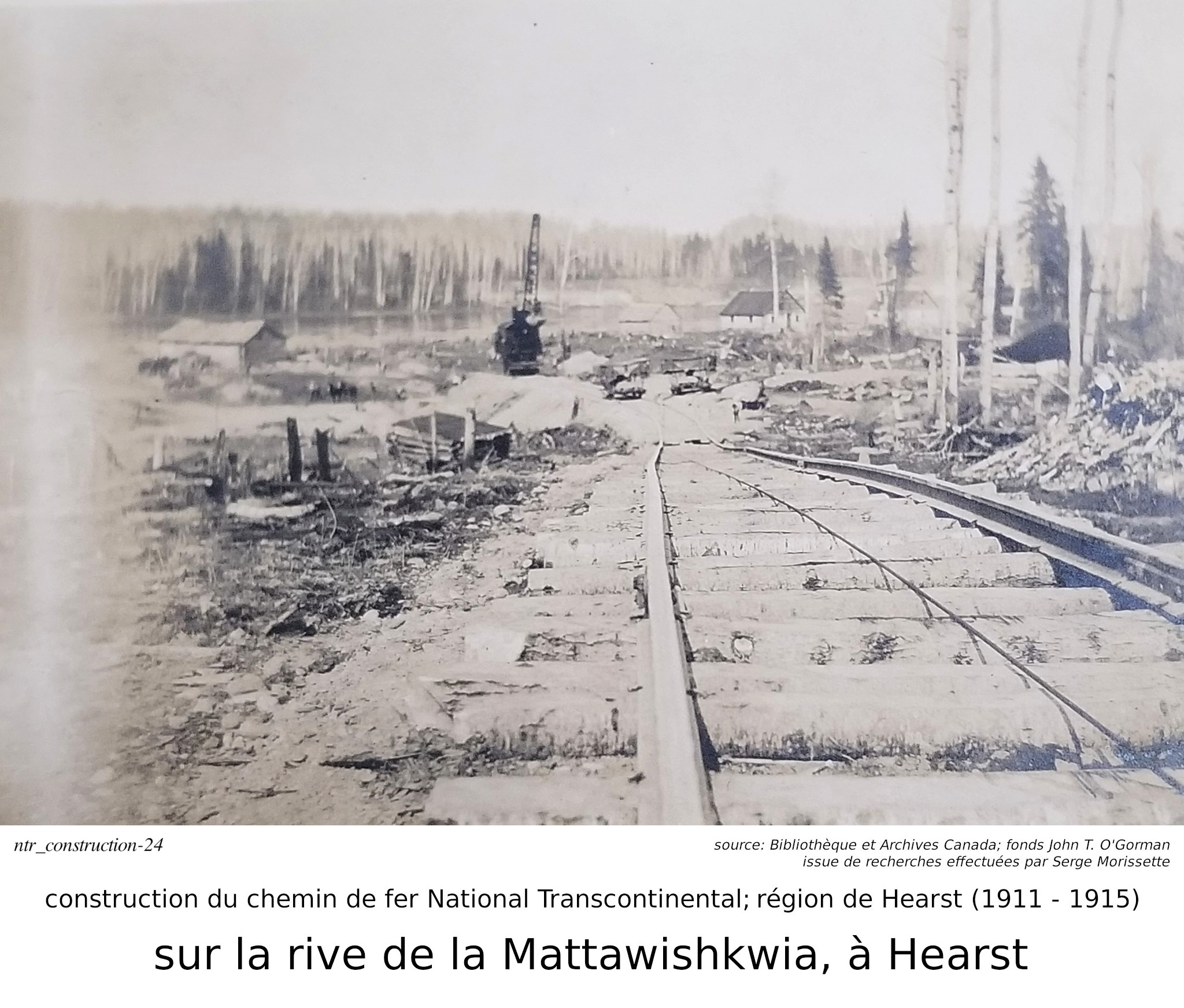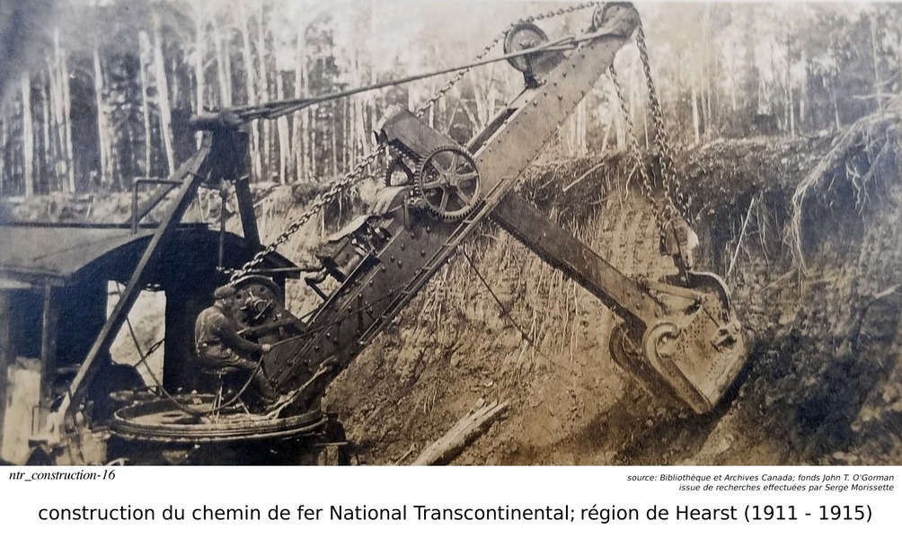 Je m'arrête sur le mot "fonds". Quelques jours après ma requête, j'ai reçu une réponse au-delà de mes espérances. Non seulement est-je reçu une réponse à l'intérieur de quelques jours, mais l'information reçu était très intéressante. Je vous le partage ici. Dans le monde de l'archivage, le mot "fonds" est synonyme à une collection. Donc, lorsque l'on dit que les photos font parties du "fonds" John T. O'Gorman, ça veut dire qu'elle font parties de sa collection personnelle. Dans ce cas-ci, la collection, ou le fonds, consiste en 166 photos données aux Archives Nationales du Canada en 1983, par John T. O'Gorman, le personne qui a pris (ou à qui appartenait) ces photos! Bibliothèque et Archives Canada m'a fait parvenir ce lien, qui décrit le fonds John T. O'Gorman. J'en ait produit la description ci-contre. De retour à Serge et à ses publications. Dans Facebook/Hearstory, Serge a publié environ une centaines de ses photos. J'en publi ici moins d'une trentaine, la plupart dans cette section de construction du chemin de fer, mais j'en ai aussi une dans la section de la gare de Hearst, et quelques unes dans la section de la rotonde, près de la gare. J'ai dû me retenir... j'ai été tenté d'en produire beaucoup plus, mais je crois qu'avec ceux publiées ici, j'ai atteint le but que je m'était fixé... celui de démontrer la contruction du chemin de fer, dans la région de Hearst. Je répète que Serge est celui qui a découver cette mine d'or. Je n'est fait que lui "emprunter" ces photos, les organisées différement, et ajouté des commentaires, basé sur mon interprétation de ces photos. Bien sur, certains des commentaires dans Facebook/Hearstoy, m'ont aussi aidé à formuler mes conclusions. ==== Nous avons déjà mentionné que Hearst était un centre divisionaire, donc une centre ferroviaire assez important, comportant une gare plus grande et des installations pour la réparation et la maintenance de locomotives, comportant une rotonde et une table tournante. Nous discuterons de la gare, et de la rotonde dans quelques lignes.