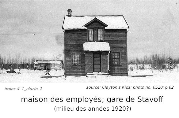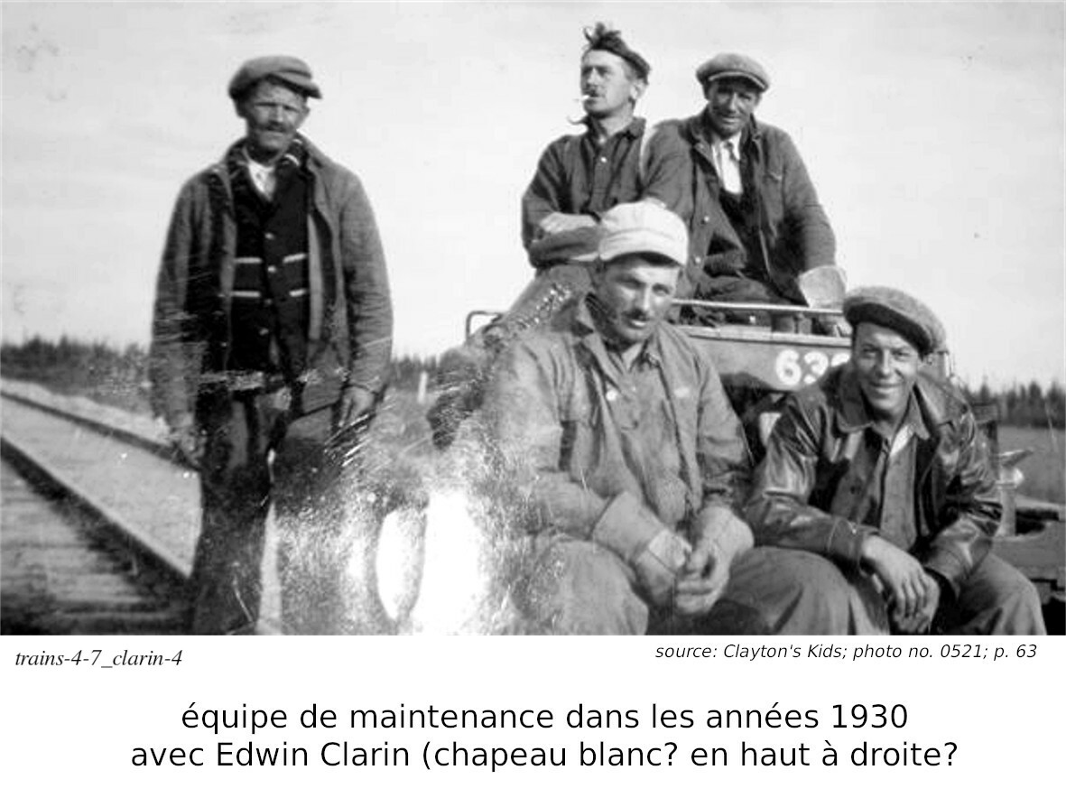 Nous y voyons aussi le moyen utilisé par les équipes de maintenance pour voyager à l'intérieur de leur section (et probablement plus loin): le "motorcar" aussi appelé "speeder", petite platforme motorisée pour aller sur les rails. L'histoire d'Edwin et d'Agnes Clarin est racontée dans le livre "Clayton's Kids", aux pages 62 à 65. Elle est parallèle à plusieurs immigrants de cette époque. L'histoire nous apprend aussi que les gares des endroits comme Savoff et Ogahalla avaient une maison pour les employés; ceux-ci y demeuraient avec leur famille, partageant la même maison. Celle-ci était à deux étages, avec quatres chambres à coucher à l'étage, et quatres pièces au rez-de-chaussé (cuisine, salon, salle à diner, et une quatrième pièce). Les gares étaient à de 6 ou 7 miles (10-12km) de distance entres elles, et une équipe de quelques travailleurs entretenait chaque section.
