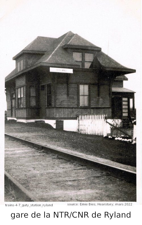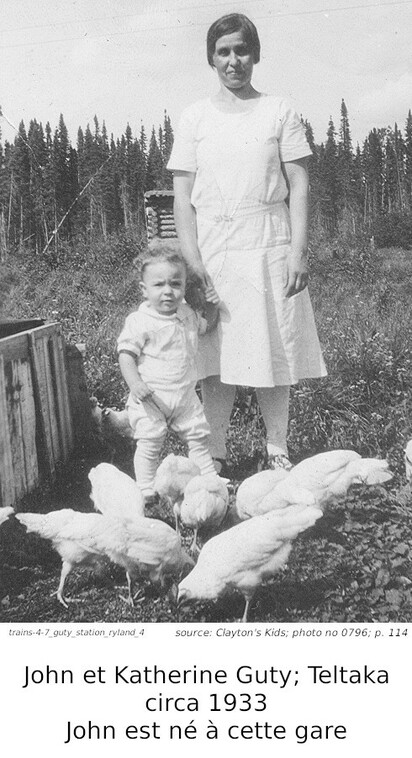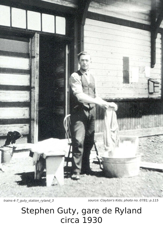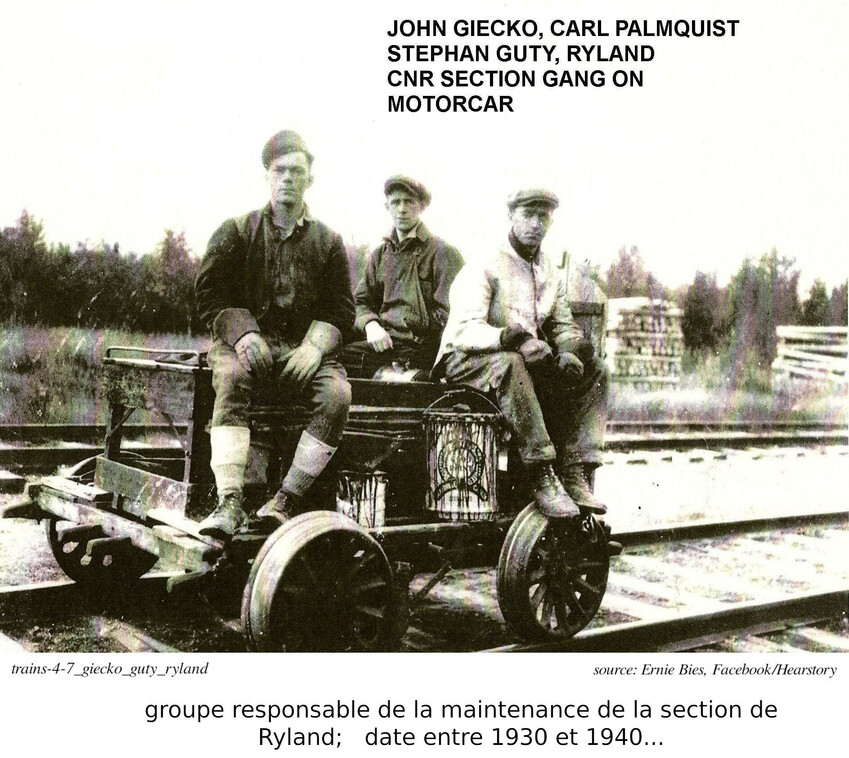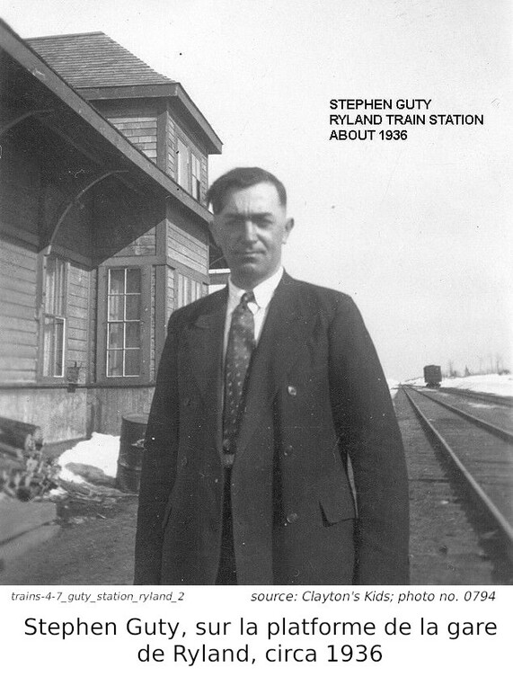 Nous venons de parler de John Geicko, immigrant ukrainien. Ce que je n'avais pas mentionné est que son immigration avait été parrainé par Stephen Guty, un autre ukrainien, déjà établi au Canada, l'année précédente. Stephen travaillait sur le chemin de fer et venait du même village que John. Lorsque John est arrivé au Canada, ils ont travaillés, pour un certain temps, sur la même équipe de maintenance. Stephen a travaillé de 1926 ou 1927 jusqu'à 1962 pour le Canadien National (CNR), qui avait pris en charge le chemin de fer National Transcontinental en 1918. Il a travaillé surtout dans les sections de différentes gares entre Hearst et Nakino. C'est pourquoi on le voit ici sur la platforme de la gare de Ryland. En même temps, nous avons un bel ensemble de cette station. J'ai mentionné plus haut que, pour plusieurs années, le train était le meilleur moyen de transport, qu'il n'y avait pas de route à l'ouest de Hearst. Plusieurs bébés sont nés dans des gares le long de ce parcour.