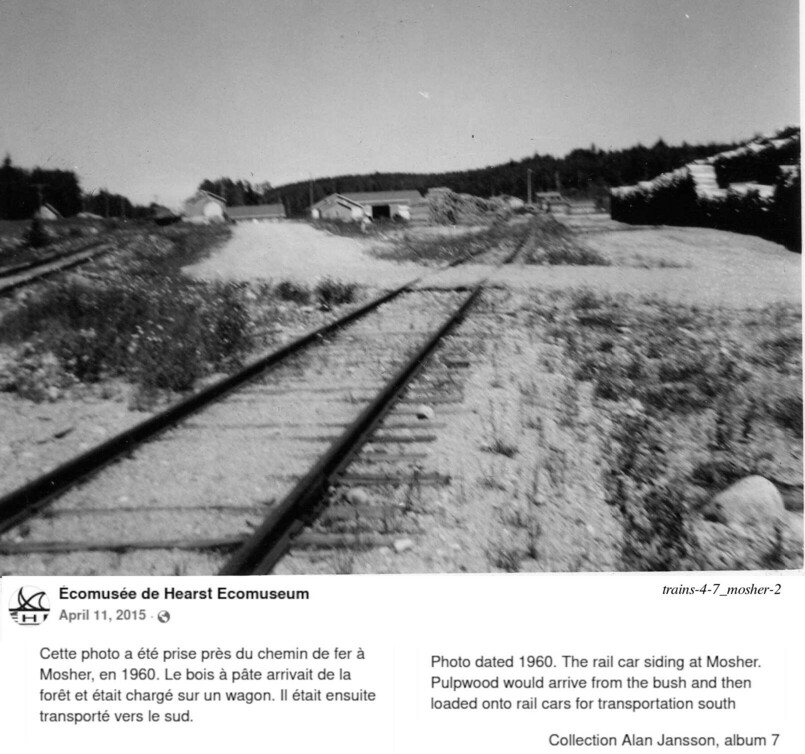 Un livre pourrais être écrit sur les différents moulins à scies de la région. Cette page est sur l'impact des chemins de fer dans la région... Ce qui nous amène Mosher, arrêt sur le réseau de l'Algoma Central. Les deux premières photos nous démontrent comment l'industrie forestière dépendait du chemin de fer. Celui-ci était utilisé pour emmener le bois à l'usine de pâtes et papier de Sault Ste. Marie (ou celui de la Spruce Falls à Kapuskasing, pour les municipalités à l'est de Hearst). Plusieurs de nos pionniers ont survécus grâce à la vente de bois aux usines de pâtes et papier. Le chemin de fer était critique pour leur survit. Nous avons deux photos de la gare de Mosher. Plusieurs travaillants ont utilisés cette gare pour se rendre soit à Hearst, ou pour venir à leur travail...