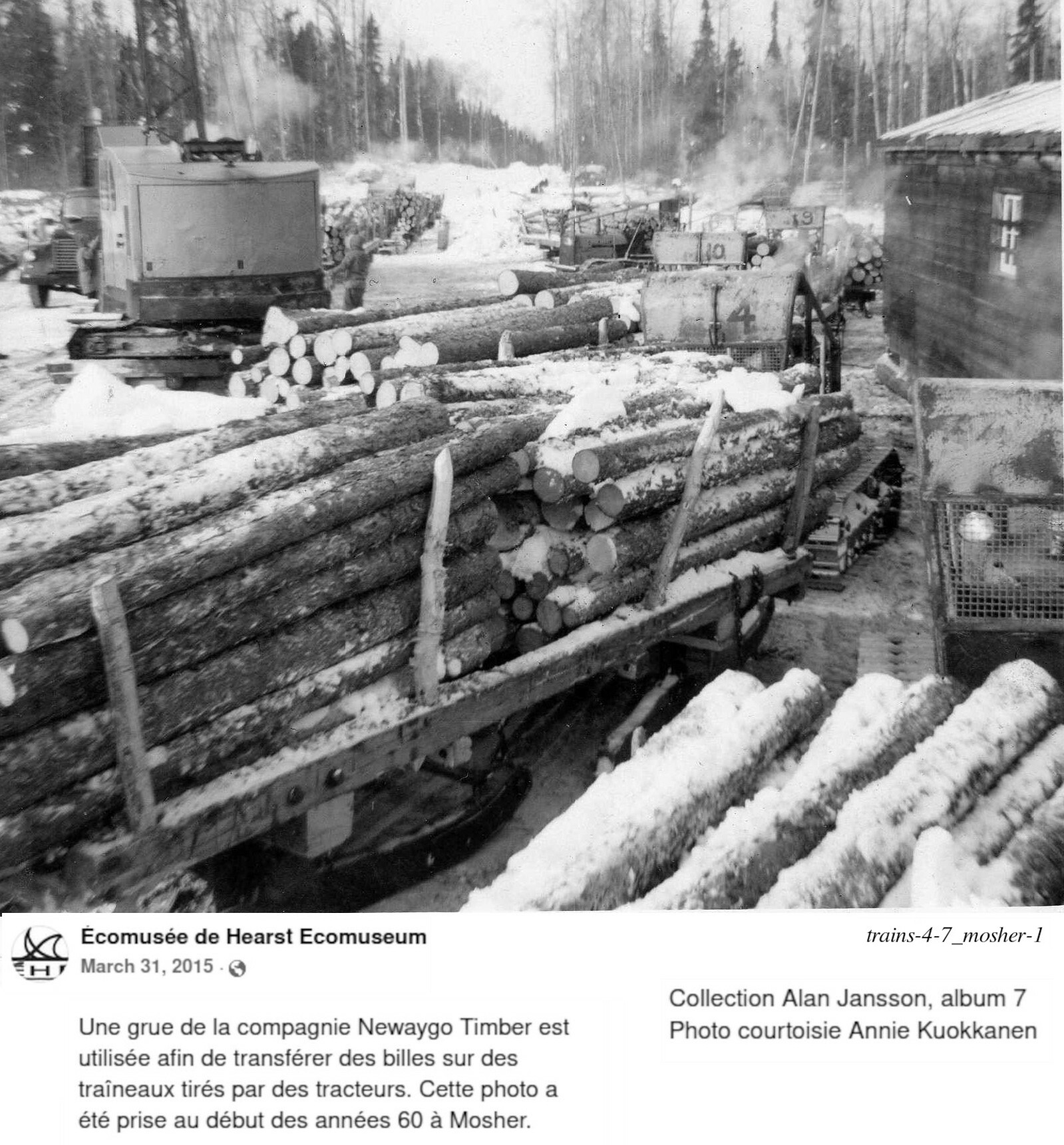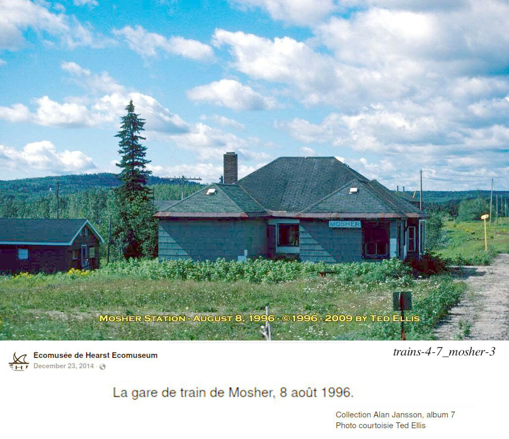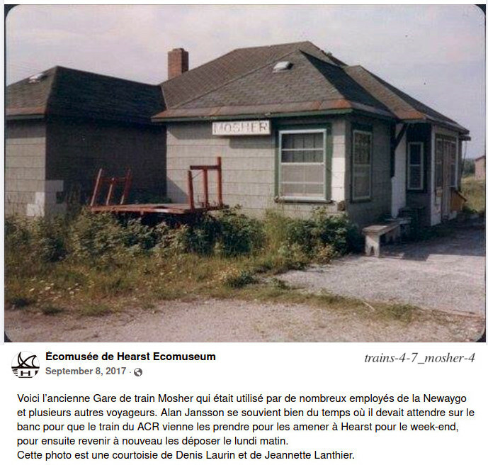 La famille de Stephen Guty en est un exemple: trois de ses enfants sont nés dans trois différentes gares: John, dans celle de Teltaka en 1932; Nida, dans celle de Nagagami en 1934; Vola, dans celle de Ryland en 1936 (information de Facebook/Hearstory; Ernie Bies, mars 2022). C'est pourquoi j'ai mit la photo de Katherine Guty, avec John, à la gare de Teltaka. L'histoire de Stephen Guty est raconté dans le livre de "Clayton's Kids", pages 114 à 119. Elle mentionne que la famille Guty, avant qu'elle ne bâtisse sa maison sur une terre en face de la gare, demeurait dans la station, puisqu'elle n'était pas très utilisée... Son histoire dans "Clayton's Kids" donne un peu plus de détails concernant les équipes qui travaillaient sur la maintenance du chemin de fer: en plus du contremaître, il y avait habituellement deux travailleurs; le printemps, après le dégel, il était normal d'employer quelques autres membres pour aider à niveler les rails, et changer les traverses pourries ou endomagées. Allons maintenant à Mosher, pour illustrer une autre utilité du chemin de fer. Pour la région de Hearst, le transport ferroviaire pour l'industrie du bois a toujour été indispensable. Indirectement, nous l'avons illustrés avec les différentes photos récente de la gare de triage de Hearst.