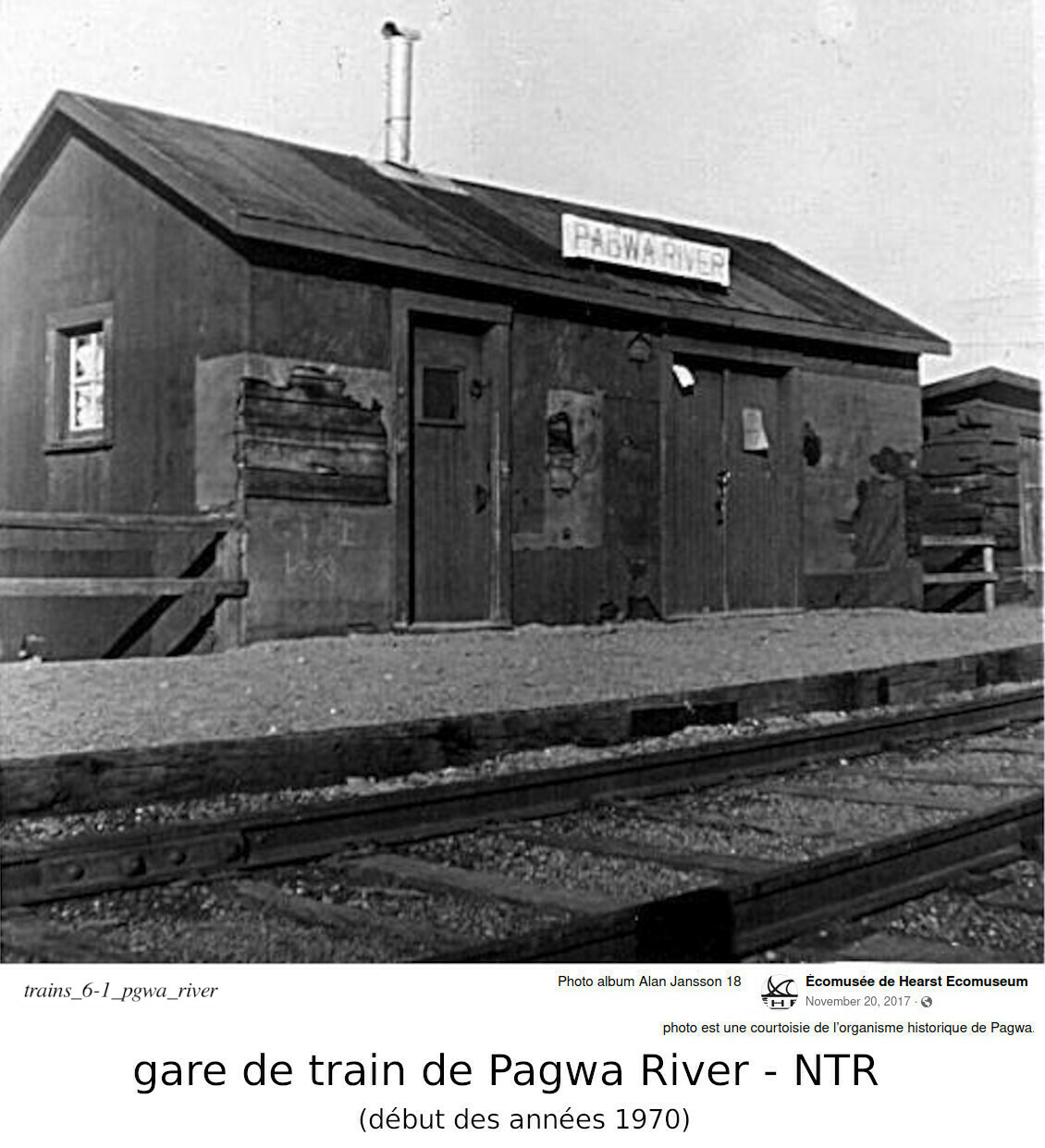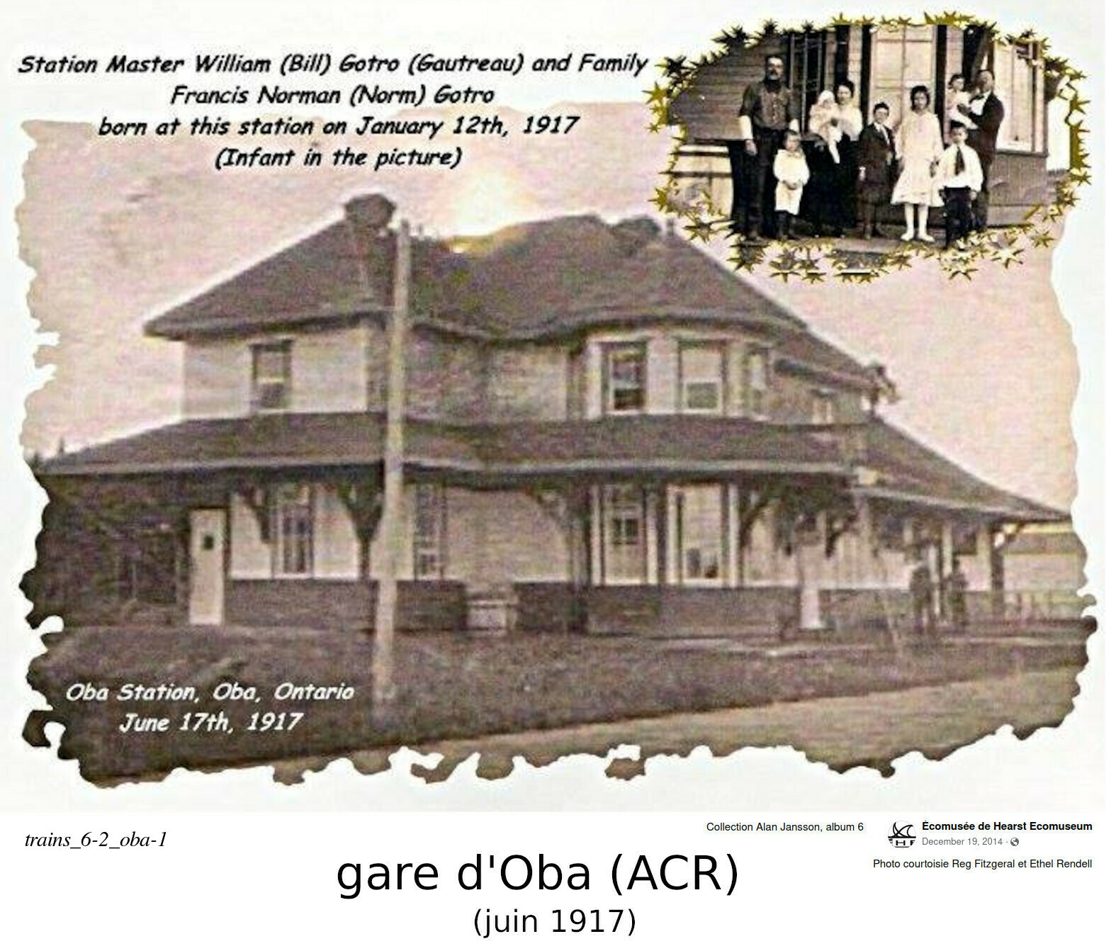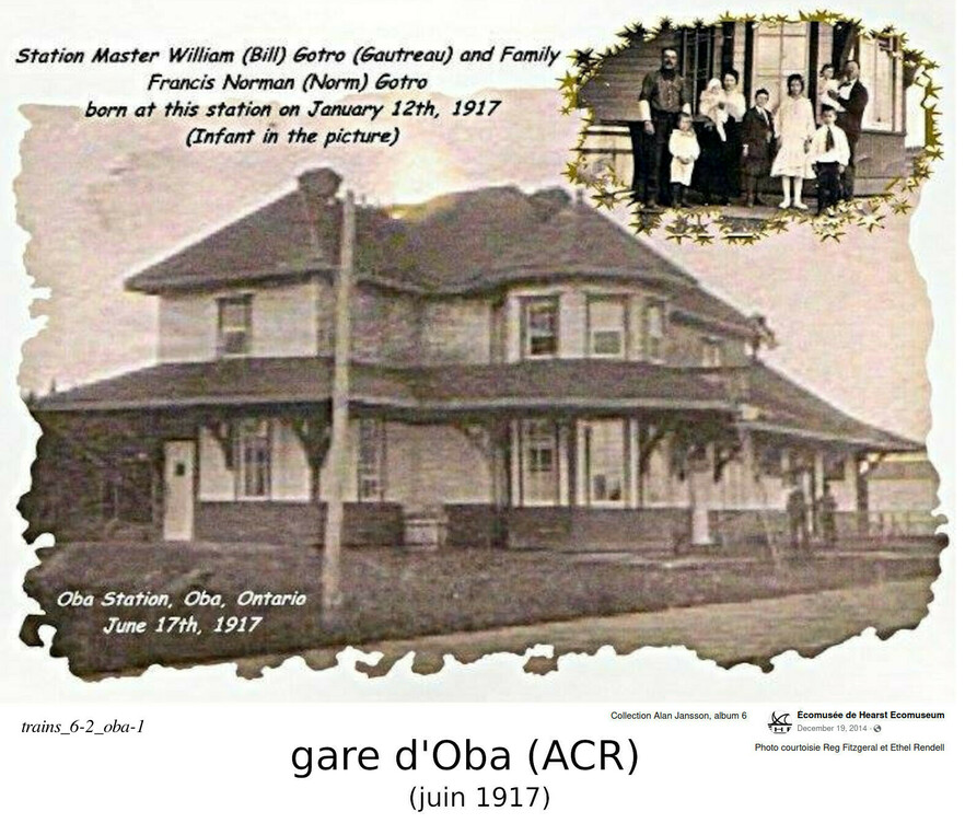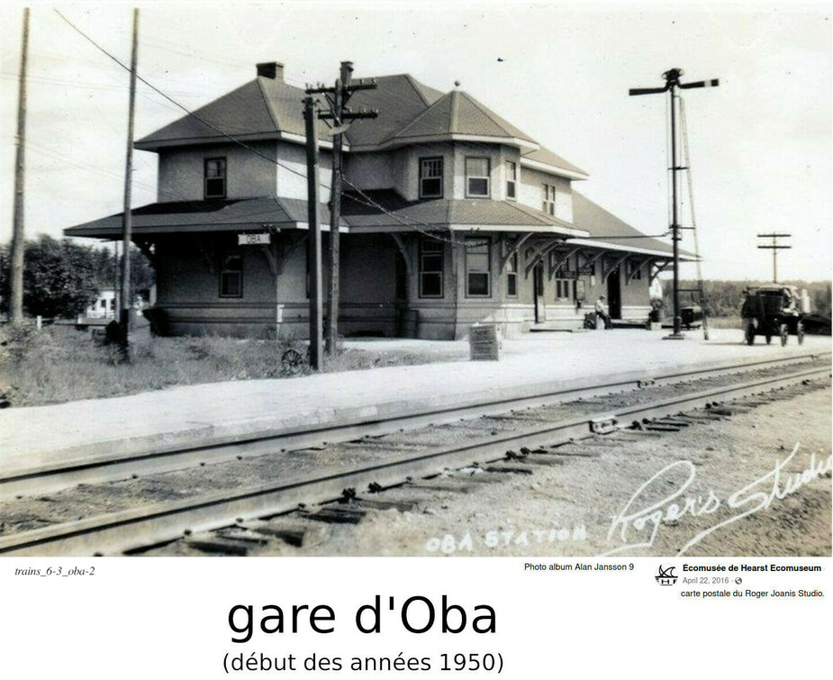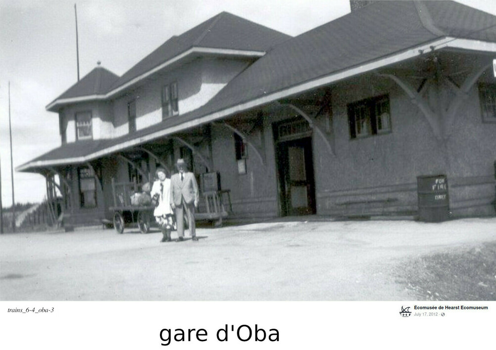 Voici une photo de la gare de Pagwa River, au mileage 78.6 miles à l'ouest de Hearst, sur le chemin de fer National Transcontinental. Et une photo de la gare d'Oba, au mileage 245 au nord de Sault Ste. Marie (ou 31 miles au sud de Hearst), sur le chemin de fer de l'Algoma Central. Ca semble être une carte postale, daté de 1917, avec la famille du gérant de gare. De cette angle, cette gare ressemble plus à une maison qu'à une gare.