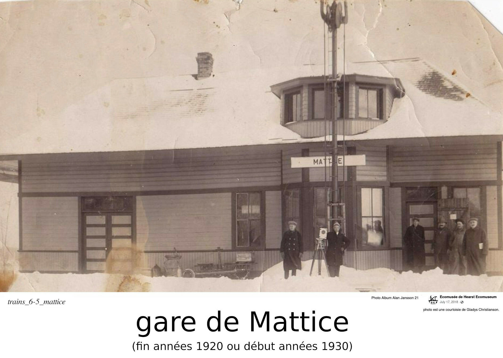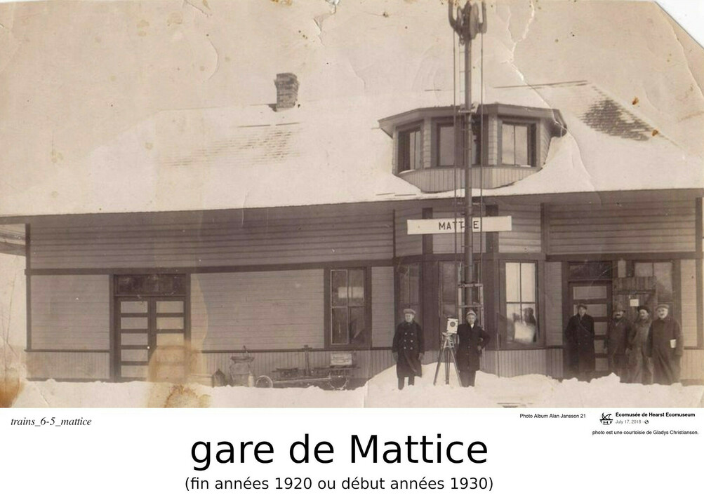 La grande majorité des premiers travailleurs arrivés à Hearst travaillaient pour la construction du chemin de fer. Nous venons de terminer un comte-rendu sur la construction de tronçon de la région de Hearst. Après la construction de ce chemin de fer, celui-ci devait être maintenu. Il y avait donc aussi les travailleurs qui devaient maintenir les rails sur tout le long du tronçon. Ces personnes demeuraient souvents aux gares parsemées à intervales semi-régulier le long de la voie ferrée. Nous avons énumérés ces gares/arrêts de Nakina jusqu'à Cochrane, et du Sault Ste. Marie jusqu'à Hearst. Oui, les trains arrêtaient à ces gares (mais pas toujours à toutes les gares; certains arrêts étaient seulement "sur demande"). Les premières années, la maintenance du chemin de fer demandait beaucoup de main d'oeuvre. Une grande parti de cette main d'oeuvre nous provenait d'immigrant venant surtour d'Europe de l'est, de la Scandinavie, de la Russie. Il y avait plusieurs raison pour les habitants de ces pays à venir au Canada: guerre civil; récession; futur économique incertain; attrait de l'aventure... Le chemin de fer était divisé en plusieurs "sections" long de 10 à 15 kilomètres chacune (certaines plus longues que d'autres). Pour chaque section, un contremaitre était engagé, avec une équipe de travailleur(s). Ils partageaient une maison fournie par la compagnie de chemin de fer. Ce groupe de travailleurs était responsable de maintenir et de réparer les rails à l'intérieur de leur "section". En général, chaque section avait une gare. D'où la distance relativement constante entre les différentes gares le long des routes. Les gares était toute bâtient suivant un plan regulier. Sauf pour la station de Hearst, puisque Hearst était à un centre divisionaire. Je traiterai la station de Hearst très bientôt; pour l'instant, je me consacrerai sur les petites gares le long de soit le chemin de fer National Transcontinental, et du chemin de fer de l'Algoma Centrale. Avant les années 1930, il n'y avait pratiquement pas de routes pour se rendre dans la région de Hearst. Les gens arrivaient et partaient en train. Même dans la région de Hearst, il n'y avait pas beaucoup de route. Certes, il y avait les rues en villes... boueuses l'été, et enneigées l'hiver. Le pont du chemin (route 11) pour traverser la Mattawishkwia n'existait pas avant 1930; seulement celui du la NTR. La transcannadienne, nous le verrons plus tard, a été construite à l'ouest de Hearst dans les années 1940. La route du Lac Ste-Thérèse, passé le "pit de gravier", fut construit vers la fin des années 1920. Aucune route se rendant à la chaîne des lacs. Le transport était donc en train. Vous aviez une terre, et vouliez vendre votre bois à une compagnie de pâtes et papier? Le train. Dans les prochaines lignes, mon but est de montrer comment le chemin de fer a façonné la vie de certains de nos premiers pionniers. J'introduirai certains personnages, ou certains endroits, avec un petite description. La plupart des photos nous proviennent soit d'articles sur Facebook/Hearstory, ou du livre "Clayton's Kids: Pioneer Families of Hearst Public School".