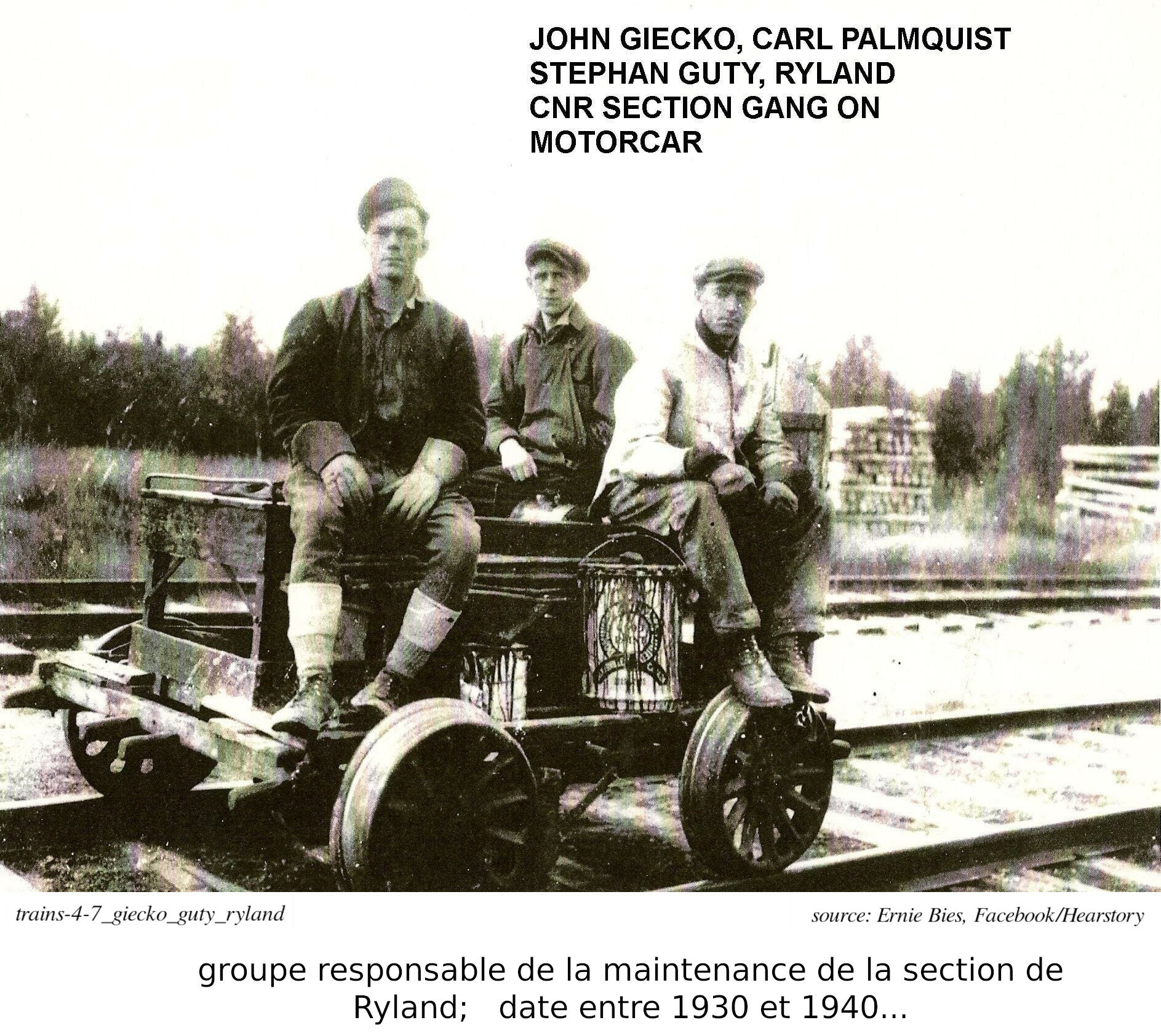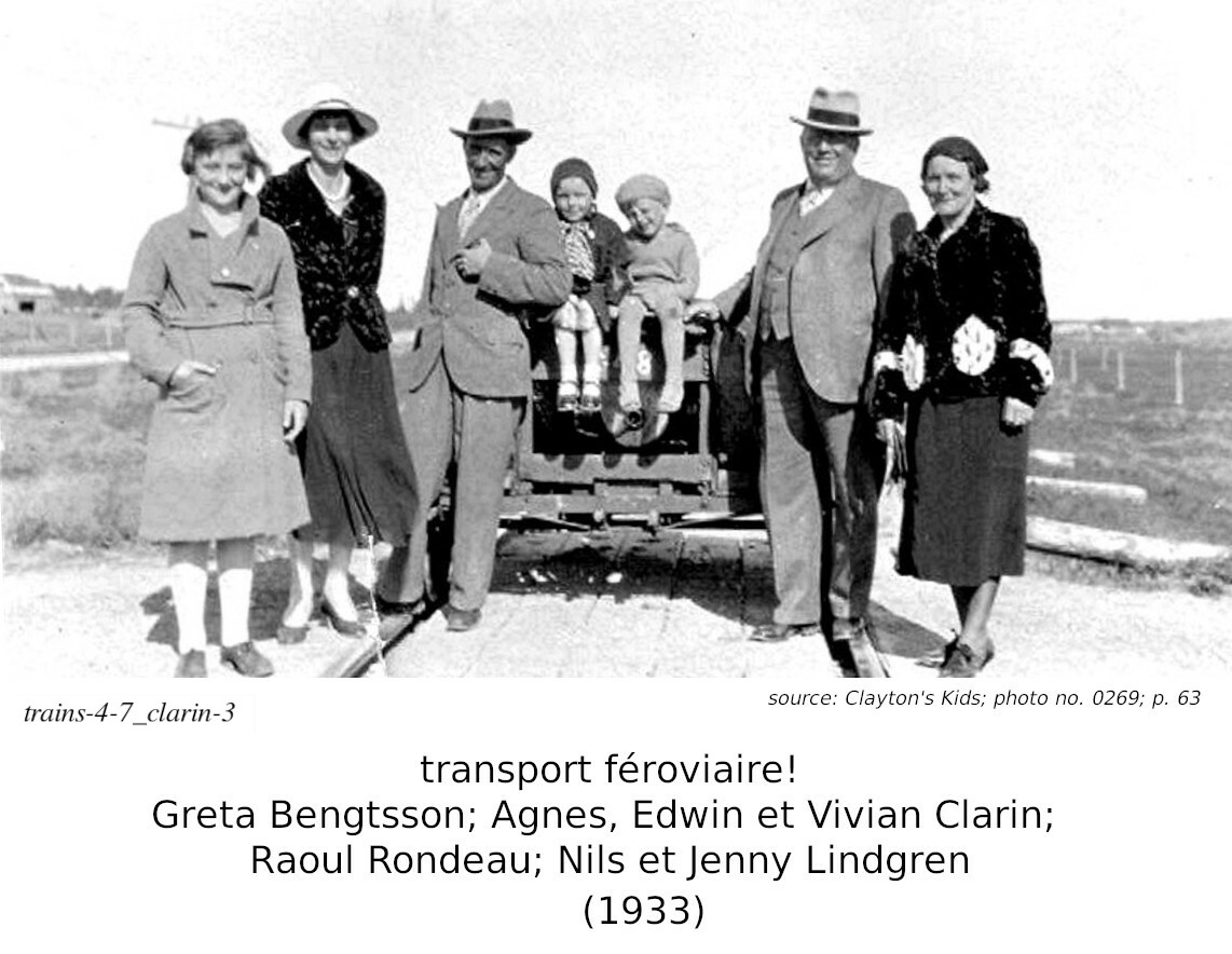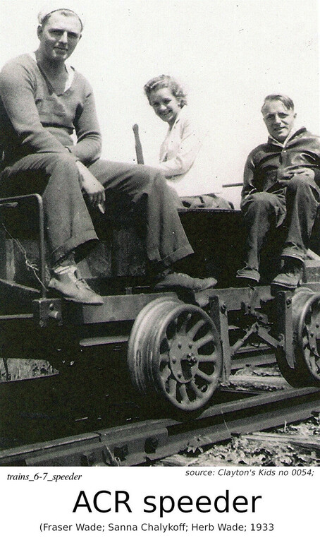 La dernière photo de cette section est celle d'un speeder, sur la ligne de l'ACR. Les trois personnes sur le speeder sont Fraser Wade, Sanna Chalykoff, et Herb Wade). La famille Wade déménagea à Hearst du Sault Ste. Marie (Clayton's Kids, p.347-354). Et les Chalykoff nous viennent de Bulgarie (Clayton's Kids, p.54-58).