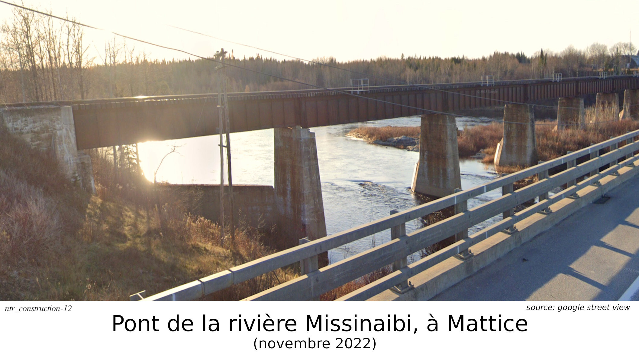 Pourquoi suis-je convaincu que c'est ce pont? Regardez la capture d'écran, de Google Street View, datée de 2022, prise du pont de la rivière Missinaibi. C'est le même pont ferroviaire. L'île au centre. Cette collection de photos furent prisent dans la région de Hearst. C'est documenté. La rivière Missinaibi est la seule de cette envergure. Nous pouvons donc dire avec confiance, que ce pont est celui de la rivière Missinaibi de Mattice.