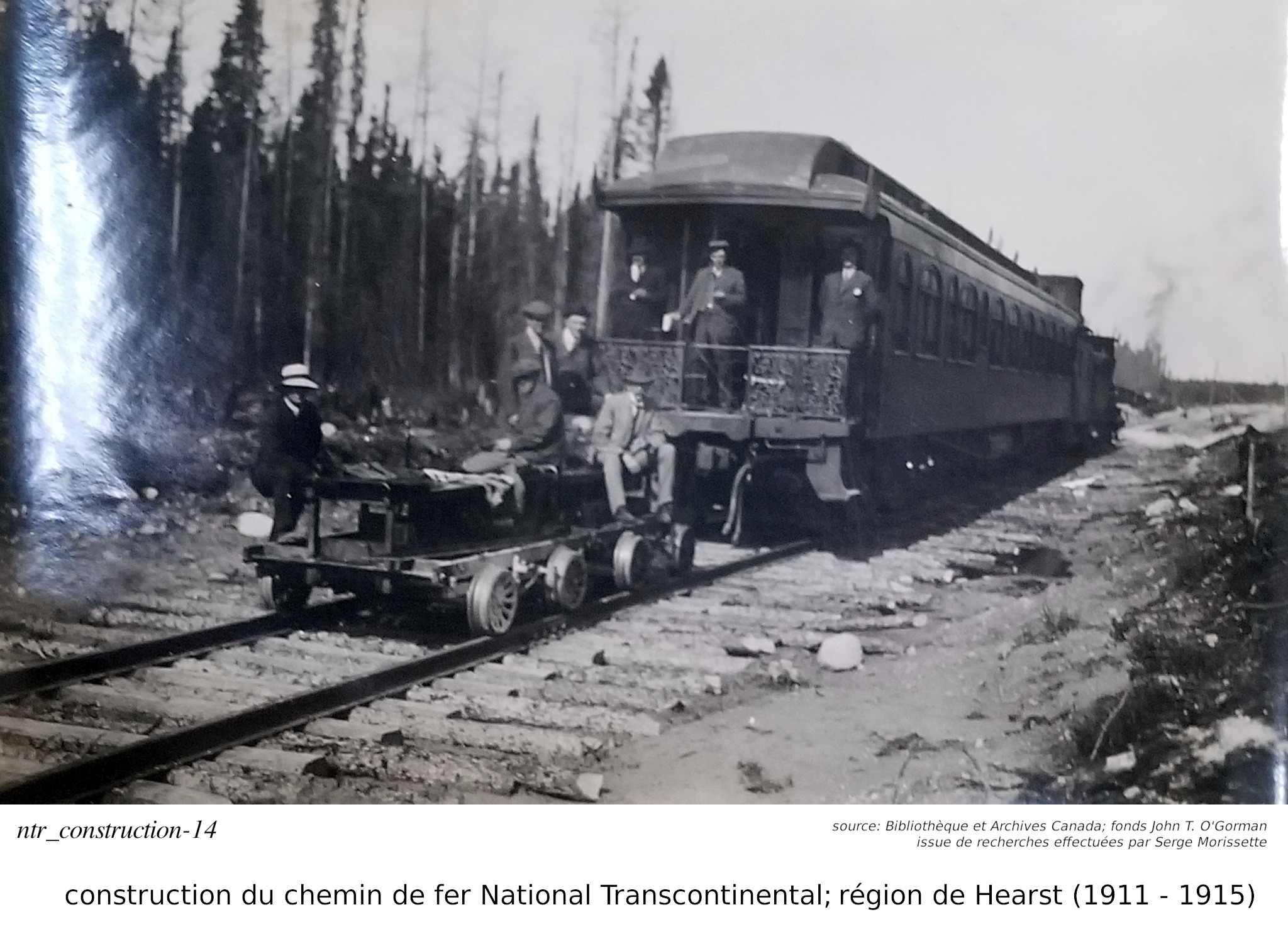 Cette photo m'intrigue un peu. Ce ne sont pas des travaillant journaliers, mais plutôt des hommes d'affaires. Ils semblent avoir leur wagon passager personel. Les traverses de rails ne semblent pas être en état de permanence: les largeurs ne sont pas tous égaux, et ne semblent pas être équaries parfaitement. Et si je compare ces personnes avec les personnes d'une des photos de la gare de Hearst de circa 1913, j'y vois certaines ressemblances... Serais-ce des inspecteurs, ou des haut dirigeants de la compagnie qui y sont venue inspecter l'état de la construction? C'est ce que je tend à croire...