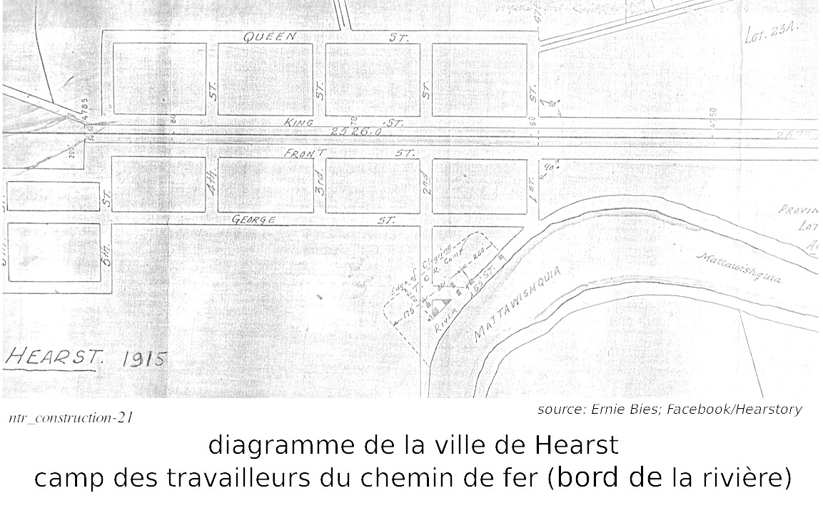 Nous passons maintenant à une autre série de photos. Le croquis fourni par Ernie Bies dans Facebook/Hearstory nous démontre où était le camp principal pour la construction to chemin de fer pour la région de Hearst ("T.C.R. Camp" - TransContinental Railway Camp) sur la rive de la rivière, sur le croquis. Cette série de photos est au nombre de six.
