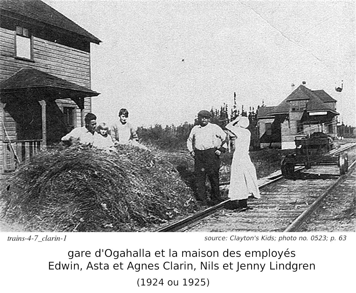 Retournons en arrière, jusqu'au début des années 1920 et 1930. De retour sur le réseau du Canadien National (CNR), entre Hearst et Nakina, aux arrêts Savoff (63.9 miles; 102.8 km à l'ouest de Hearst) et Ogahala (104.6 miles; 168.3 km à l'ouest de Hearst). En avril 1924, à l'âge de 30 ans, Nils Edvin Olofsson, arrive au Canada, de la Suède, et débarque... à Savoff; son épouse est venue le rejoindre au mois d'août. Il se cherchait un vie meilleur, pour lui et sa famille. Comme d'autres immigrants avant lui, et d'autres après lui, Nils Edvin Olofsson anglicisa son nom. Il devin Edwin Clarin. Pourquoi Savoff? Son beau-frère y travaillait, pour le CNR. Edwin se joingna à plusieurs Suèdois qui ont travaillés sur le tronçon entre Hearst et Nakina. Comme on le voit sur une des photo ci-jointe, il travailla aussi sur la section ou la gare d'Ogahalla reposait.